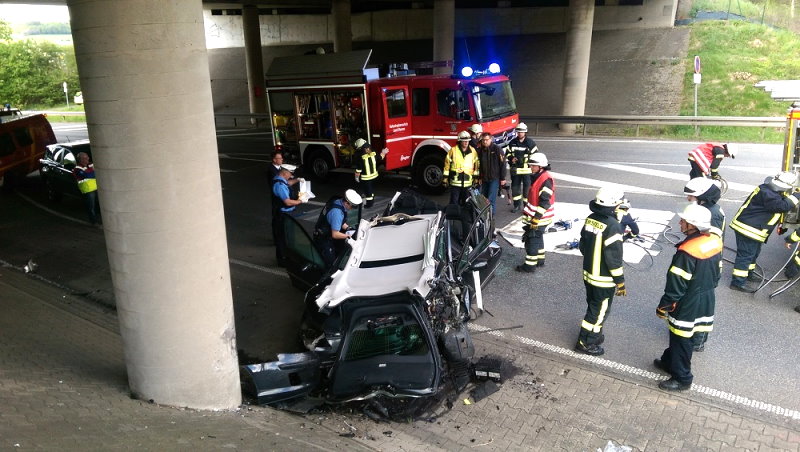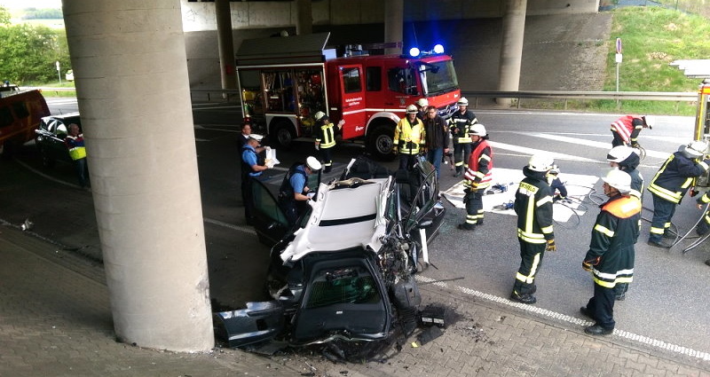 überquerte die Gegenfahrbahn und krachte frontal und scheinbar ungebremst gegen einen Brückenpfeiler der Autobahnbrücke. Durch die Wucht des Aufpralls wurde der Fahrer schwer verletzt und im Fußraum seines Fahrzeugs eingeklemmt. Die eingetroffenen Feuerwehrkräfte aus Remsfeld versuchten zuenächst, den Schwerstverletzten schonend aus dem Fahrzeugwrack zu befreien. Da sich der Zustand des Verunglückten jedoch erheblich verschlechterte, musste auf eine Crashrettung zurück gegriffen werden. In dem Fall kann auf mögliche zusätzliche Verletzungen, die aber als Bagatelle eingestuft werden, keine Rücksicht mehr genommen werden, nur um das Leben des Patienten zu retten. Der Schwerverletzte wurde mit dem Rettungswagen und Notarzt einem Krankenhaus zugeführt. Während der Rettungsarbeiten musste die B 323 halbseitig gesperrt werden. Der Verkehr wurde weichselseitig an der Unfallstelle vorbei geführt. Am Fahrzeug entstand wirtschaftlicher Totalschaden.