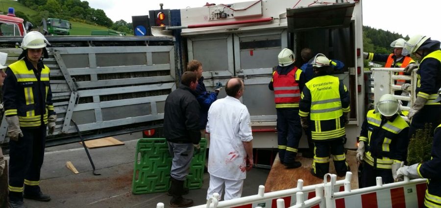 In einer darauf folgenden Kurve kippt der Anhänger aus bisher noch nicht geklärter Ursache zur Seite und begrub einen PKW unter sich, der am Straßenrand parkte. Zum Glück befand sich hier niemand im Fahrzeug, die Insassen hatten wenige Minuten vorher das Fahrzeug verlassen. Im weiteren Verlauf soll er noch ein zweites Fahrzeug beschädigt haben. Auch ein Baum der sich im Bereich der Strasse befand wurde umgerissen. Ob es auch Beschädigungen an der Bahnanlage gegeben hat, ist derzeit noch nicht bekannt. Der LKW hatte sowohl auf den Anhänger wie auch auf der Zugmaschine lebende Schweine transportiert. Im Anhänger befanden sich insgesamt 85 Schweine, wovon auch einige Tiere ums Leben kamen. Insgesamt hatte das Fahrzeug 165 Schweine geladen und sollten zum Schlachthof transportiert werden. Der Fahrer hatte in Twiste auf einem Bauernhof die Tiere übernommen, nach rund 2km kam es dann zum Unfall. Zum Einsatz kamen die Feuerwehren Twiste und Berndorf mit insgesamt 40 Einsatzkräften.