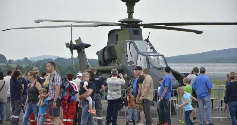 Die Bundeswehr selbst hatte dazu reichlich Fahrzeuge und Waffensysteme aufgefahren. Von der Transall, über die bis ende 2014 in Fritzlar beheimatete BO105 bis hin zum Kampfhubschrauber Tiger wurde so einiges ausgestellt. In beeindruckenden Flugshows zeigten die Piloten eindrucksvoll, wozu Mensch und Maschine in der Lage sind. Loopings, Steilkurven, Sturzflüge und rollen um die Längsachse waren Küreinlagen der Waffensysteme BO 105 und Tiger. Den Blick einmal nach oben gerichtet, zeigten sich die Fallschirmjäger aus Stadtallendorf, welche zunächst nur als Punkt am Himmel zu erkennen waren. Aus rund 1500 Meter Höhe sprangen fünf Soldaten mit ihren Fallschirmen aus einem Hubschrauber vom Typ Bell. Kaum waren die Schirme geöffnet, verdeutlichten die Springer mit Rauchfahnen ihre spektakulären Flugmanöver.