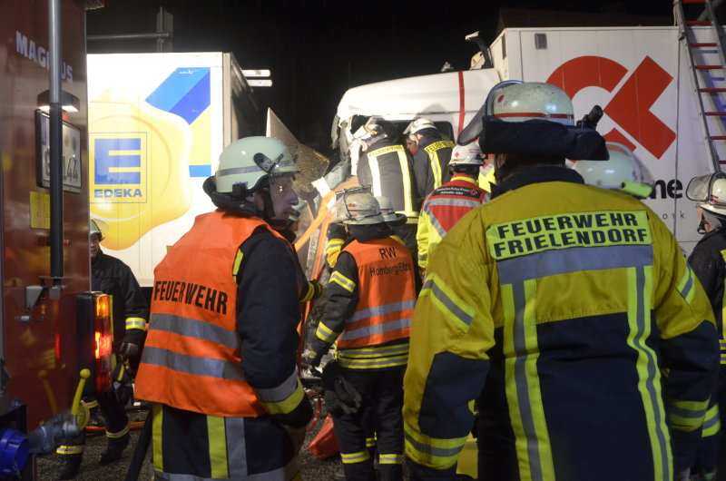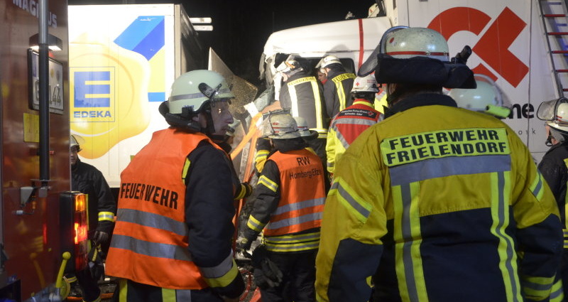 Der Aufprall war so heftig dass der Vordermann fast 10 Meter über die Kreuzung geschoben wurde. Der Fahrer des Lastzuges wurde in seinem Fahrzeug massiv eingeklemmt und musste von der Feuerwehr in einer aufwendigen Rettungsaktion aus dem Fahrzeug befreit werden. Mit Seilwinden mussten die Fahrzeuge auseinander gezogen werden, um den 52-jährigen Fahrer aus seinem total zerstörten Fahrerhaus zu befreien. Nachdem der schwer verletzte Mann aus dem Fahrzeug befreit war, wurde er nach einer ärztlichen Erstversorgung an der Unfallstelle unter Notarztbegleitung in einer Fachklinik für Unfallopfer eingeliefert. Der Fahrer 47-jährige Mann aus Felsberg, der sich im voraus fahrenden LKW befand, musste auf Grund eines schweren Schocks ebenfalls in ein Krankenhaus eingeliefert werden. Die Bundesstrasse musste während der Rettungsarbeiten voll gesperrt werden. Insgesamt waren neben der Polizei 42 Einsatzkräfte an der Unfallstelle eingebunden. Nach ersten Informationen der Polizei wird der Sachschaden auf rund 115.000 Euro geschätzt. hn/we
