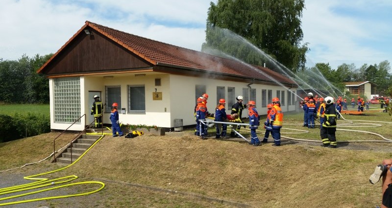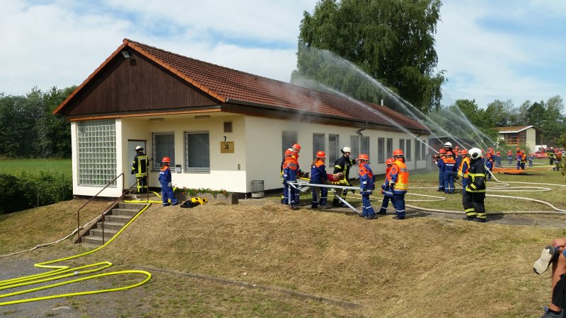 Lohfelden – Am Samstagvormittag gegen 11 Uhr führte die Feuerwehr Lohfelden eine ganz besondere Übung für die Jugendfeuerwehr in Vollmarshausen durch. Auf einer Geburtstagsfeier kam es durch Unachtsamkeit zu einer Gasexplosion an einem Grill im Küchenbereich eines Gebäudes. Insgesamt waren an der Feier 25 Personen beteiligt, 12 davon erlitten zum Teil schwerste Verletzungen.