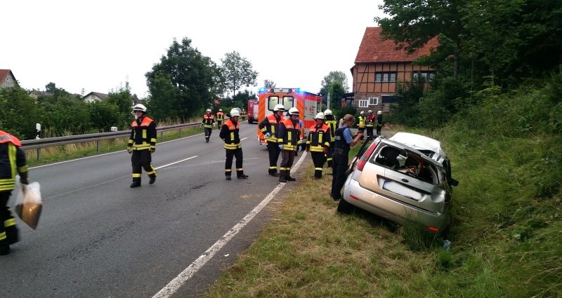 Aus bisher noch nicht geklärter Ursache kam der Mann im Kurvenbereich in die Bankette, krachte gegen eine Leitblanke und schleuderte in Richtung eines Parkplatzes. Im weiteren Verlauf riss er ein Parkplatzschild um, fuhr eine Böschung hinauf und überschlug sich. Beim Eintreffen der Feuerwehr waren alle Personen bereits aus dem Fahrzeug, wobei eine herausgeschleudert wurde. Nach ersten Erkenntnissen gab es zwei schwer verletzte Personen, die nach einer ärztlichen Erstversorgung an der Unfallstelle mit den Rettungshubschraubern Christoph 44 aus Göttingen und Christoph 13 aus Bielefeld in Krankenhäuser eingeliefert wurden. Zwei weitere Personen wurde leicht verletzt in ein nahe gelegenes Krankenhaus eingeliefert. Wie es zu dem schweren Unfall kommen konnte, ist derzeit noch unklar. Die B450 war für die Dauer der Rettungsmaßnahmen voll gesperrt.
