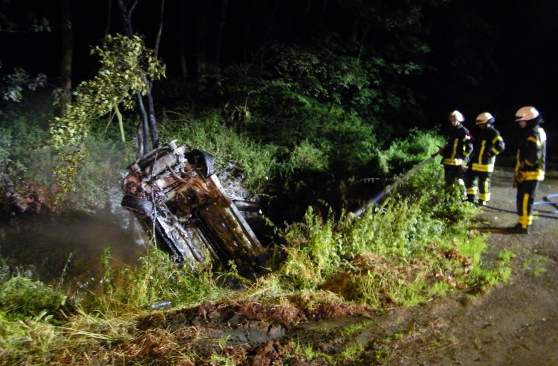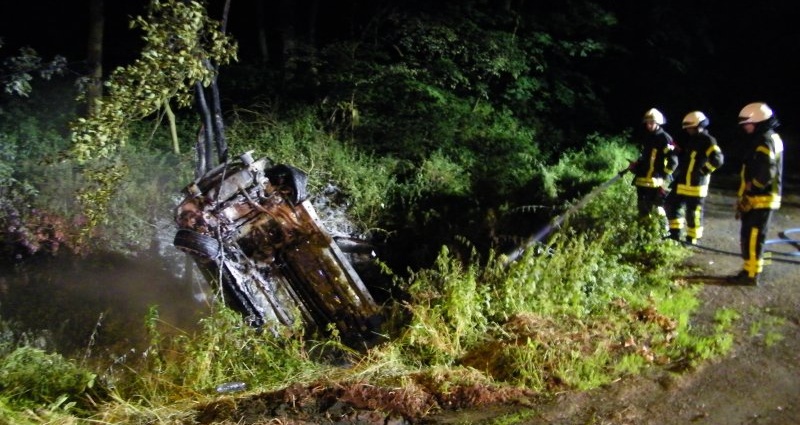 Kassel – Gegen 3 Uhr erreichte die Leitstelle der Feuerwehr Kassel ein Notruf, dass es auf der Im Druseltal, Höhe „Neue Drusel“ zu einem PKW-Unfall mit Brandfolge gekommen ist. Die eintreffende Einsatzkräfte fanden an der Einsatzstelle einen PKW im Graben vor, der in voller Ausdehnung brannte.