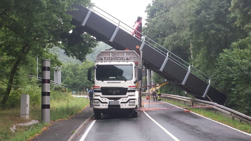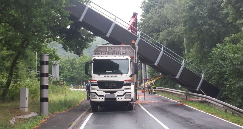 Holztransporter reißt Fußgängerbrücke mit