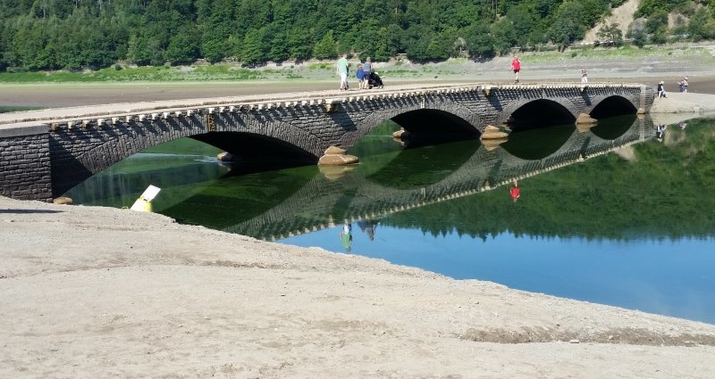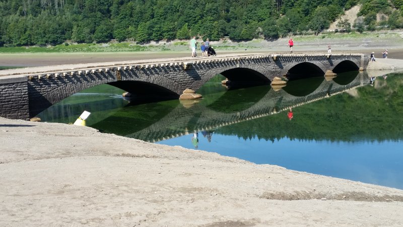 Dann wird die Asler Brücke Baujahr ca. 1890 sichtbar, ja sogar begehbar. Die Menschen strömen in Scharen dort hin das alte Gemäuer sehen zu können. Insgesamt hat die Brücke eine Länge von 60 Metern, ist 4,50 Meter hoch und spannt sich in vier Bögen über die Eder. Als die Brücke errichtet wurde, war noch nicht abzusehen, das in den Jahren danach eine Staumauer entstehen wird. 1914 wurde das Bauwerk das erste mal überflutet. Auch heute noch ist die Brücke bis auf die Geländer komplett intakt und könnte rein theoretisch komplett befahren werden. Allerdings wird dies durch zwei Schlagbäume verhindert. 1982 und 1989 wurde die Brücke restauriert und anschließend unter Denkmalschutz gestellt.