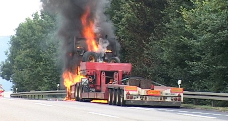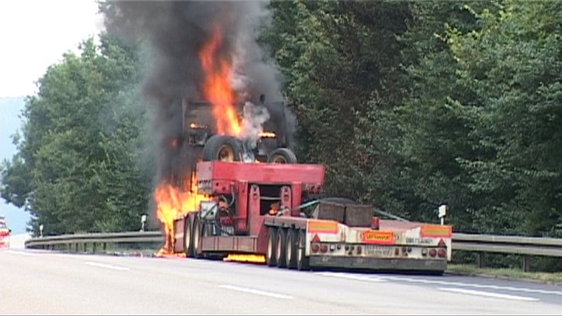 Darauhin fuhr der Fahrer am Ende des Beschleunigungsstreifens auf die Standspur, konnte gerade noch sein Handy und seine Geldbörse greifen, bevor die Flammen auch schon gegen das Fahrerhaus schlugen. Hierbei erlitt der Fahrer leichte Verbrennungen. Beim Eintreffen der Feuerwehr aus Bad Hersfeld stand die Zugmaschine bereits im Vollbrand. Im Tank der Zugmaschine befanden sich ca. 500 Liter Dieselkraftstoff. Während der Löscharbeiten musste die A7 in Richtung Süden voll gesperrt werden. Es bildete sich ein Stau von mehreren Kilometern. Der Auflieger des unbeladenen Schwertransporters nahm nur wenig Schaden. Der Sachschaden wurde von der Polizei mit 80.000 Euro beziffert.