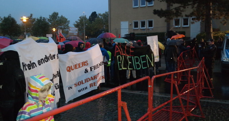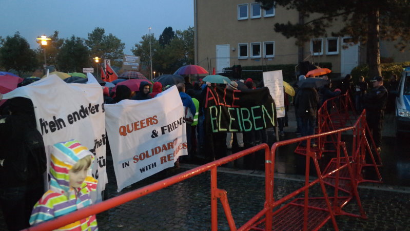 Etwa doppelt so viele Gegendemonstranten kamen dem Aufruf der SPD und dem Deutschen Gewerkschaftsbund nach. Sie sehen hier eine Ausgrenzung der Menschen die nach Deutschland kommen und Hilfe erwarten. Deutschland sei ein offenes Land und stolz auf seine offenen Grenzen. Die AfD setz auf Ausländerfeindlichkeit und gäbe die falschen Antworten. Wir wollen mit unserem „Hier sein“ ein Zeichen setzen, so Uwe Frankenberger von der SPD Kassel in einem Interview. Auch die Polizei setzte ein Zeichen mit einem Großaufgebot an Einsatzkräften, um mögliche Auseinandersetzungen im Keim zu ersticken. Die Demomastration bleib jedoch über den gesamten Zeitraum friedlich.