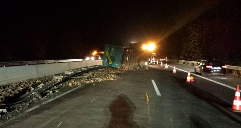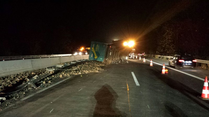 Dadurch geriet der Lastzug ins schleudern, walzte die Mittelleitplanke nieder und kippte schließlich auf der linken Fahrspur auf die Seite. Die rund 25 Tonnen Zuckerrüben, welche sich auf dem Weg in die Zuckerfabrik nach Wabern befanden, verteilten sich über alle vier Fahrspuren. Dadurch musste die Autobahn für mehrere Stunden in beide Richtungen voll gesperrt werden. Nach letzten Informationen wird die Vollsperrung noch bis in die frühen Morgenstunden andauern. Nach Angaben der Polizei wird der Sachschaden auf rund 100.000 Euro geschätzt.