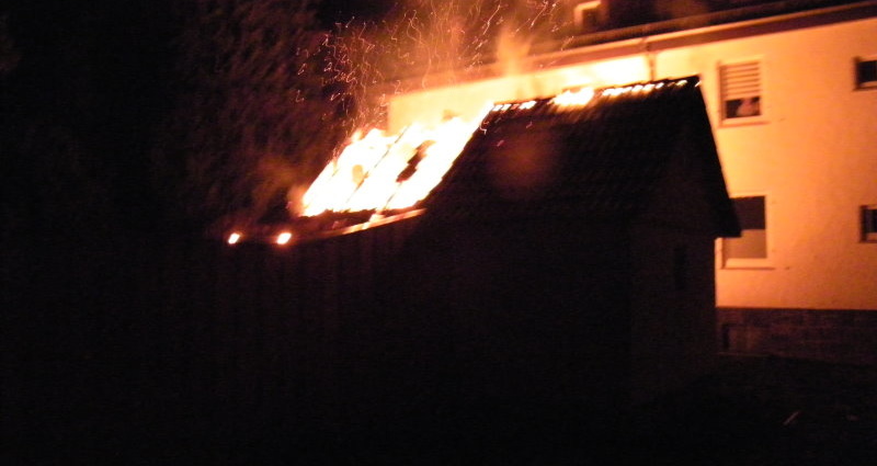 Beim Eintreffen der Feuerwehr stand eine hälfte des Daches des Gartenschuppens bereits im Vollbrand und war teilweise eingestürzt Durch den Einsatz von 2 C-Rohren und einem Trupp unter Atemschutz konnte eine weitere Ausbreitung verhindert und das Feuer schnell gelöscht werden. Nach 90 Minuten war der Einsatz für die Feuerwehr beendet. Der Sachschaden wird auf 10.000 Euro geschätzt.