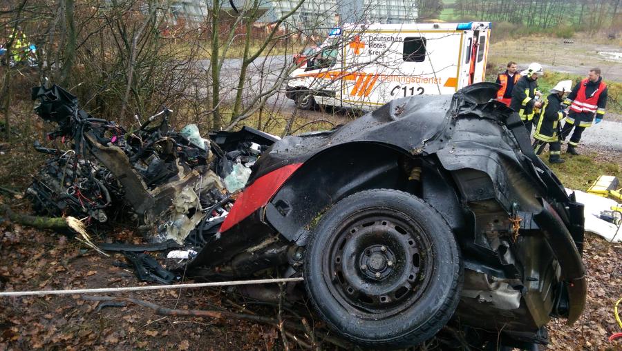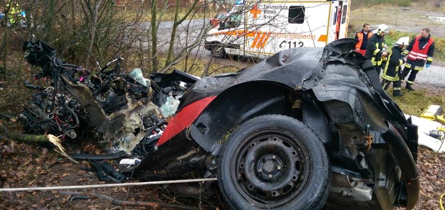 aus dem Bereich Weimar verlor vermutlich aufgrund nicht angepasster Geschwindigkeit bei regennasser Fahrbahn die Kontrolle über sein Fahrzeug, kam nach rechts von der Fahrbahn ab und fuhr auf eine dort beginnende Schutzplanke. Im weiteren Verlauf wurde das Fahrzeug in die Luft katapultiert und krachte etwa 20 Meter weiter in einer Höhe von zwei Metern gegen einen Baum. Durch die Wucht des Aufpralls wurde das Fahrzeug am Baum völlig zerfetzt, die Vorderachse und der Motor