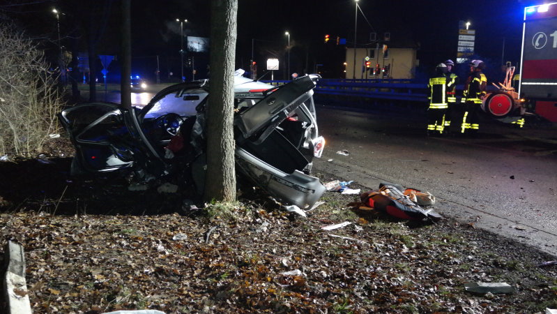 Aus bisher noch nicht geklärter Ursache kam es dann zu dem folgenschweren Unfall. Ein BMW krachte hierbei in die Leitplanke und wurde im Frontbereich total zerstört. Ein VW schleuderte rückwärts gegen einen Baum und erlitt einen Totalschaden. Der Fahrer wurde in seinem Fahrzeug eingeklemmt und musste von der Feuerwehr befreit werden. Nach einer ärztlichen Erstversorgung an der Unfallstelle wurde die schwer verletzte Person in ein Krankenhaus eingeliefert. Vier weitere am Unfall beteiligte Personen wurden zum Glück nur leicht verletzt. Das dritte am Unfall beteiligte Fahrzeug wurde ebenfalls erheblich beschädigt. Um die genaue Unfallursache klären zu können, wurde ein Gutachter in die Ermittlungen eingebunden.