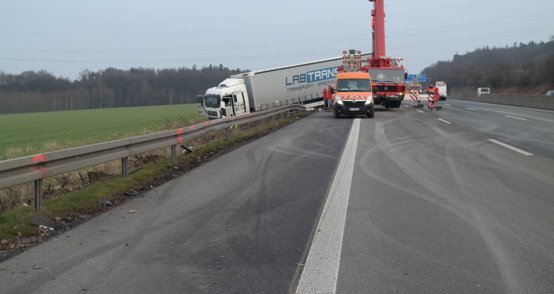 Kassel – Zwei LKW-Unfälle haben sich am Freitagmorgen nahe Kassel ereignet, bei dem mindestens fünf Menschen verletzt wurden. Gegen 7.00 Uhr verlor der Fahrer eines mit 12 Tonnen Fleisch beladenen Sattelzug auf der A44 zwischen der Anschlussstelle Zierenberg und Bad Wilhelmshöhe die Kontrolle über sein Fahrzeug und kam nach rechts von der Fahrbahn ab. (- wir berichteten -) Hier walzte er rund 50 Meter Leitblanke platt und kam dann ohne umzustürzen in einer bedrohlichen Hanglage zum stehen.