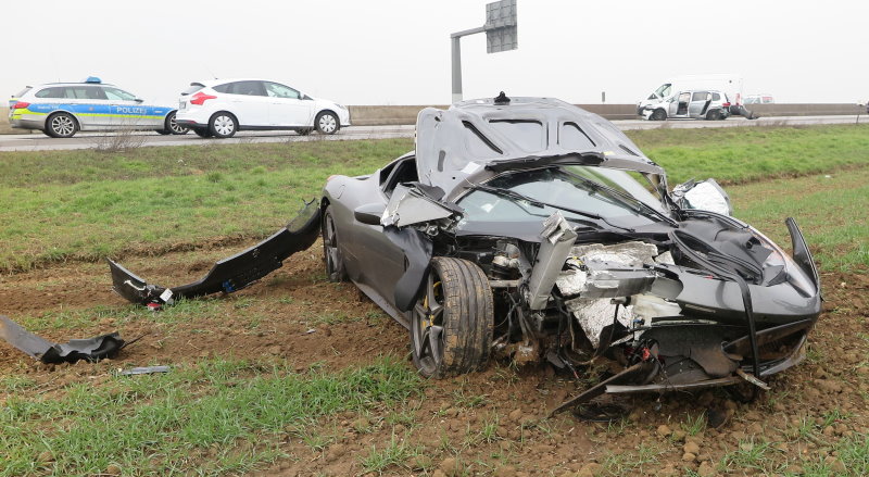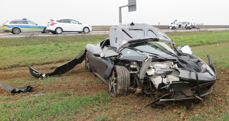 Nach derzeitigen Erkenntnissen verlor der Fahrer in Höhe der Anschlussstelle Ober-Mörlen auf feuchter Fahrbahn die Kontrolle über sein Fahrzeug. Der Ferrari geriet ins Schleudern und prallte gegen den VW Touran eines 33-Jährigen aus dem Landkreis Oberhavel, der auf der mittleren Fahrspur unterwegs war. Durch den Aufprall wurde dieser gegen einen Ford Transit auf der rechten Spur geschleudert, bei dessen Fahrer es sich um einen 32-Jährigen aus Lorsch handelte. VW und Ford streiften durch die in Gang gesetzte Drehbewegung beide die mittlere Betonleitwand und blieben schließlich quer zur Fahrbahn stehen. Der Ferrari kam nach dem Zusammenstoß rechts neben der Fahrbahn zum Stehen. Durch umherfliegende Fahrzeugteile beschädigte sich zudem der Fahrer eines Audi TT seine Ölwanne und konnte dadurch seine Fahrt ebenfalls nicht mehr fortsetzen. Alle Fahrzeugführer, sowie der 54-jährige Beifahrer des VW Touran verletzten sich bei dem Unfall leicht. Ferrari- und Transit-Fahrer wurden in ein Krankenhaus verbracht. Alle vier Fahrzeuge mussten von Abschleppdiensten geborgen werden. Der Unfallschaden liegt nach ersten Schätzungen bei rund 240.000 Euro.