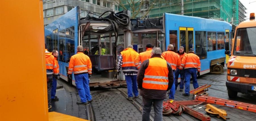 Hierbei ist das Fahrzeug aus den Schienen gesprungen, in der Mitte abgeknickt und mitten auf der Kreuzung stehen geblieben. Wie die KVG weiter mitteilte handelt es sich bei der Bahn um ein „Fahrschulfahrzeug“ das mit fünf Fahrschülern und einem Ausbilder besetzt war. Verletzt wurde bei dem Unfall niemand. Wie durch ein Wunder wurden auch keine weiteren Fahrzeuge beschädigt oder Passanten verletzt. Es kommt auf Grund der Sperrung zu erheblichen Behinderungen im Innenstadtbereich. Der Straßenbahnverkehr von und in Richtung Königsplatz ist komplett gesperrt.Wie die am Unfallort eingesetzten Beamten des Polizeireviers Mitte berichten, war die Straßenbahn gegen 13.30 Uhr durch die Fußgängerzone in Richtung Holländische Straße unterwegs. Nachdem die dreiteilige Tram mit dem ersten Drittel über eine Weiche auf der Kreuzung fuhr, schaltete die Weiche um und die beiden hinteren Glieder fuhren im 90-Grad-Winkel weiter. Nach den ersten Ermittlungen am Unfallort, schien nur ein möglicher Defekt an der dortigen Weiche ursächlich für den Unfall zu sein. In den weiteren Überprüfungen, auch durch Mitarbeiter der KVG, erhärtete sich dieser Verdacht nicht.