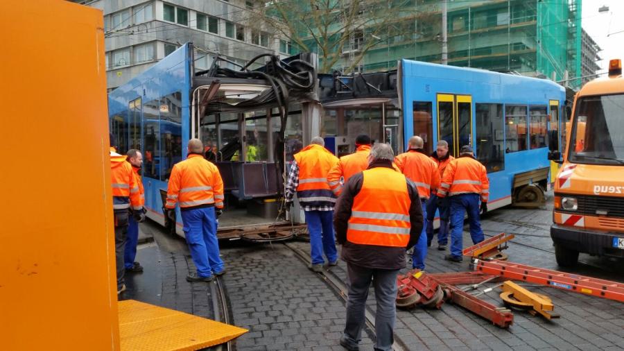 Eine genaue Unfallursache kann derzeit nicht verlässlich genannt werden. Dabei riss die Straßenbahn auseinander und sprang aus den Schienen. Das entgleiste Schienenfahrzeug blockiert seit dem Unfall die Kreuzung. Zunächst wird geprüft, ob die beiden auseinandergerissenen Teile wieder auf die Schienen aufgesetzt und anschließend abgeschleppt werden können. Sollten die enormen Schäden dieser Möglichkeit entgegenstehen, müssen die beiden Tramteile geborgen und abtransportiert werden. In jedem Fall, so die derzeitige Prognose, wird die Kreuzung noch einige Stunden blockiert bleiben.
