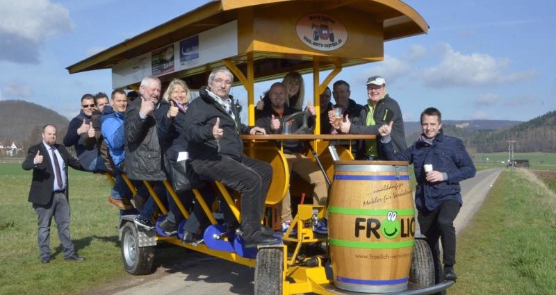 Denn beide Bürgermeister waren von der Idee so sehr begeistert, dass sie ohne Zögern zum einen die nötigen Genehmigungen zur Nutzung der Radwege ausstellten, und zum anderen selbst zur Jungfernfahrt am Freitagnachmittag nach Aue kamen. Mit „Rücksicht macht Wege frei“ appellierte Wanfrieds Stadtoberhaupt Wilhelm Gebhard noch einmal an die Rücksichtnahme gegenüber anderen Radfahrern und Fußgängern. Sein Fazit: „Ihr bereichert die Region mit einer weiteren touristischen Attraktion“. Mit 16 Sitzplätzen, darunter Zehn Pedaleinheiten, bietet der „Werra-Express“ ein Gruppenerlebnis der besonderen Art. Ausgestattet ist er mit einer Sound- und Beleuchtungsanlage, einer großen Fahrzeugüberdachung mit Ablagemöglichkeiten und einem Getränkespeicher. Es ist alles vorhanden, was einem unvergesslichen Erlebnis im Weg stehen könnte. Obwohl die Theke mit einer Zapfenlage zum Ausschank ausgestattet ist, wird es auch Kaffee-Kuchen-Touren und weitere tolle Aktionen entlang der Werra Radwege geben. Fischer: „Wir wollen mit dem Fahrrad einen kleinen touristischen Beitrag leisten, damit unsere Region noch lebendiger wird“. Und das dieses Vorhaben klappt, zeigt bereits die erste Anmeldungen, aus dem südhessischen Offenbach. Den Werra-Express kann man nur mit Steuermann mieten. Das dient nicht nur der Sicherheit, sondern die Fahrer sorgen dafür, dass jede Tour ein riesen Spaß und unvergesslich wird.
