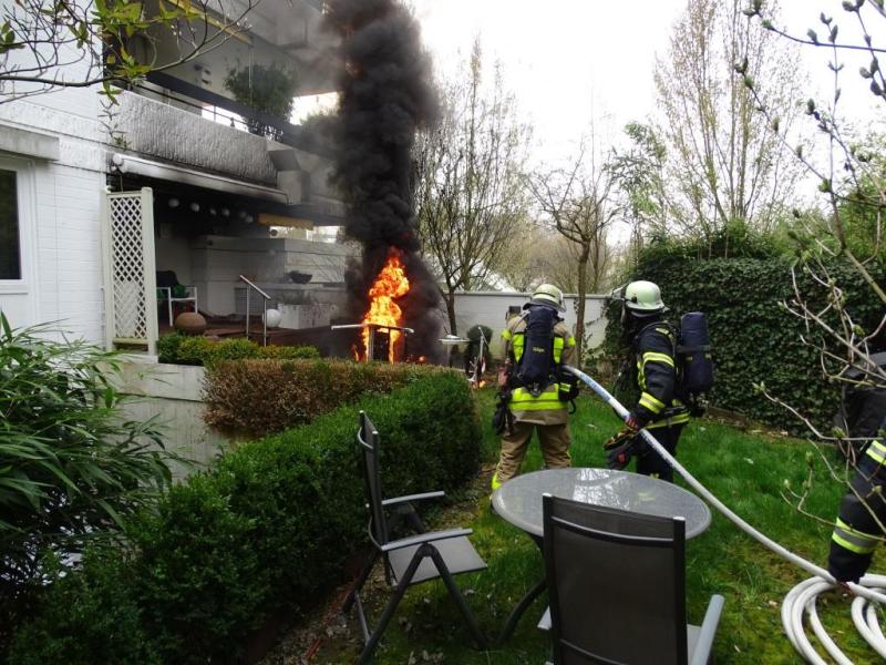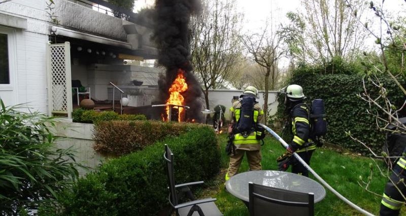 Wiesbaden – Am Sonntagmorgen gegen 10:30 Uhr wurde die Feuerwehr Wiesbaden zu einer starken Rauchentwicklung in die Flotowstraße gerufen. Bei Eintreffen der Feuerwehr hatte ein Nachbar bereits die brennenden Gartenmöbel unter dem Vordach in den Garten gezogen.