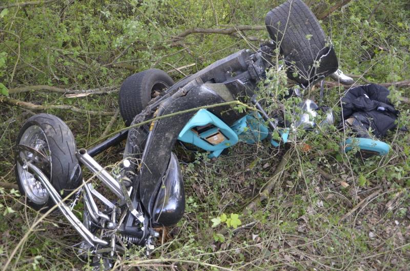 Dabei zogen sich beide Biker schwerste Verletzungen zu. Zwei Rettungshubschrauber brachten die aus Hombergstammenden Verletzten in Kliniken nach Kassel. Nach Auskunft des Feuerwehr Einsatzleiter der Feuerwehr Homberg Efze, Karsten Stein, ist es nur einem Zufall zu verdanken, dass die Verletzten gefunden wurden. Schwerverletzt robbte sich der 52-jährige Biker vom Unfallwrack zur Straße und machte so auf seine Situation aufmerksam. Vorbeifahrende Verkehrsteilnehmer bemerkten ihn und alarmerten umgehend die Rettungskräfte. Das Trike wurde vollständig zerstört. Die Straße war für mehrere Stunden voll gesperrt. Neben der Feuerwehr aus Homberg (Efze) waren auch die Rettungshubschrauber Christoph 28 aus Fulda und Christoph Gießen im EInsatz. Außerdem waren noch drei RTW zwei NEF sowie der LNA und Olrd vor Ort.
