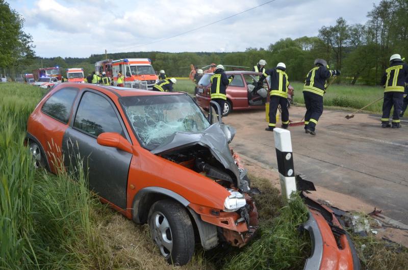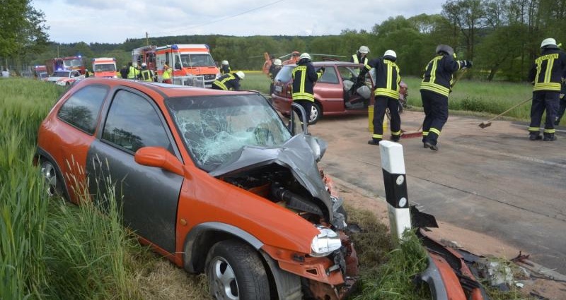 Ein 24-jähriger Schwalmstädter geriet vermutlich wegen nicht angepasster Geschwindigkeit auf regennasser Fahrbahn kurz vor Riebelsdorf mit seinem Fahrzeug auf die Gegenfahrbahn und kollidierte dort mit einer 48-jährigen Frau aus Neukirchen. Beide Fahrzeugführer wurden durch den Zusammenprall zum teil schwer, aber nicht Lebensbedrohlich verletzt. Die Frau aus Neukirchen wurde mit dem Rettungshubschrauber in eine Kasseler Klinik geflogen. Insgesamt waren drei Notärzte vor Ort im Einsatz sowie rund 30 Einsatzkräfte der Feuerwehr Neukirchen. Die Landstrasse war für knapp zwei Stunden voll gesperrt.