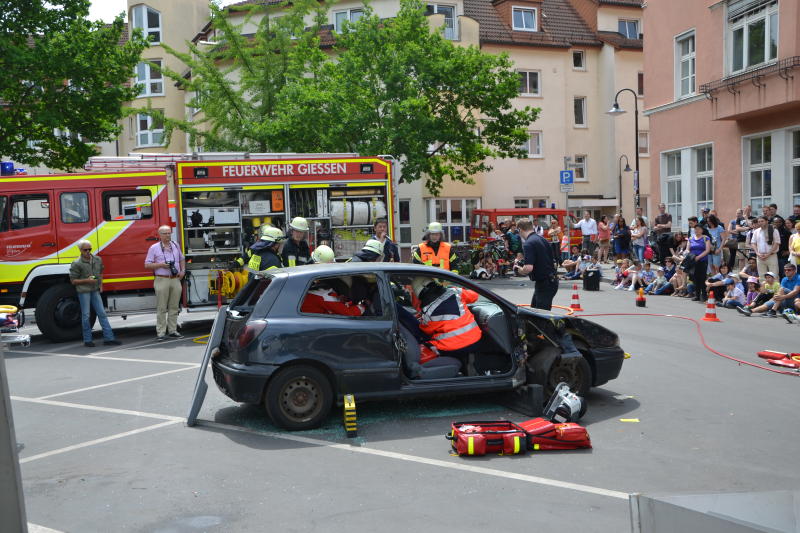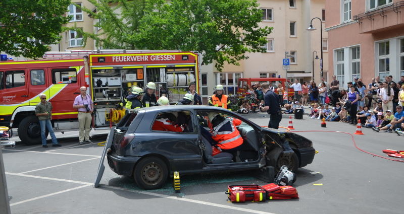 Der Rettungsdienst hat zusammen mit der Feuerwehr den Patienten aus seinem PKW befreit. Hierzu musste mit hydraulischem Rettungsgerät ein Zugang zum Patienten geschaffen werden. Hierzu trennte die Feuerwehr das Dach des PKW ab. Der Patient wurde schonend mittels Spine Board gerettet und weiter Medizinisch versorgt. Die Übung weckte großes Interesse bei der Bevölkerung. Wehrführer Gunho Rihm führte über Mikrofon durch diese sehr gelungene Übung. Zusätzlich konnten die Besucher die architektonischen Wettbewerbsbeiträge zum Neubau des Gefahrenabwehrzentrums Gießen im Museum besichtigen. Für die Kleinen Besucher, hatte die Feuerwehr bei durchaus warmen Wetter zahlreiche Wasserspiele vorbereitet.