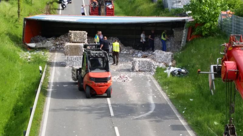 Vermutlich auf Grund von Unachtsamkeit ist der Mann zunächst in die Bankette geraten, versuchte noch zu reagieren verlor aber dann die Kontrolle über sein Fahrzeug. Der mit Papier beladene LKW kippte zur Seite uns viel um. Ein großer Teil der Ladung verteilte sich auf der Strasse. Der Fahrer konnte sich trotz des stark zerstörten Fahrerhauses selbst befreien, musste aber schwer verletzt von der Feuerwehr von dem quer liegenden Fahrerhaus herunter geholt werden. Nach einer ärztlichen Erstversorgung an der Unfallstelle, wurde der Mann schwer verletzt in ein Krankenhaus eingeliefert. Die Bergung des LKW und seiner Ladung zog sich über Stunden hin. Mit zwei Kränen wurde der LKW gegen 19 Uhr wieder auf die Räder gestellt und anschließend abtransportiert. Nach Angaben der Polizei wird der Sachschaden auf rund 100.000 Euro geschätzt. Während des gesamten Einsatzes musste die Landstrasse komplett gesperrt werden.