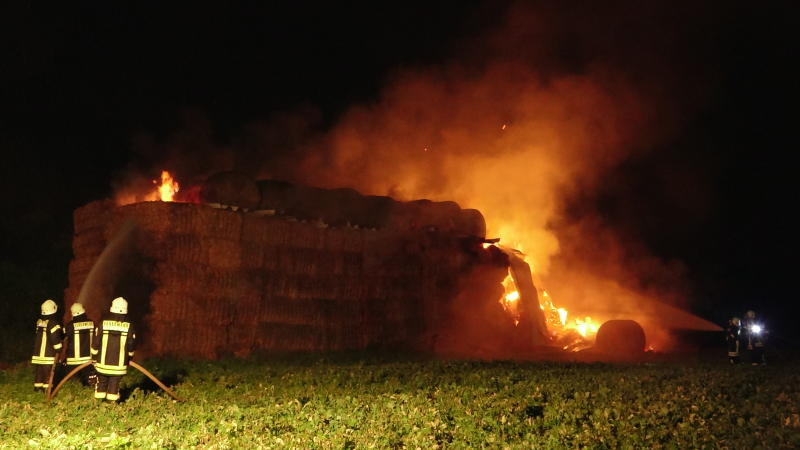 Flörsheim-Weilbach – Gegen 01:45 Uhr kam es in der Nacht zu Montag zu einem vermutlichen Blitzeinschlag in ein Strohlager in Flörsheim-Weilbach. Die rund 400 Strohballen fingen sofort Feuer.