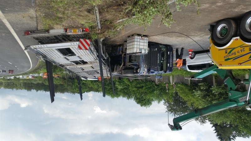 Die Zugmaschine stürzte dabei in der Gefällstrecke auf die Gegenfahrspur der Anhänger kam auf der Leitblanke zum liegen. Das Gespann hatte drei Transporter der Marke Renault geladen die auf Grund guter Ladungssicherung nicht komplett beschädigt wurden. Obwohl das Fahrerhaus auf der Seite lag, wurde der Fahrer offensichtlich nicht verletzt. Die Feuerwehr war im Einsatz musste Diesel abpumpen und die Unfallstelle reinigen. Da auch Betriebsstoffe auf die Fahrbahn gelaufen waren, muss nun geklärt werden, ob die Fahrbahn beschädigt wurde. Die Autobahn musste bis auf eine Fahrspur in beide Richtungen gesperrt werden. Die Verkehrsteilnehmer konnten auch die Standspur mitbenutzen. Auf der Autobahn kam es durch den Unfall zu erheblichen Behinderungen und Kilometer langen Staus. Über die Höhe des Sachschadens konnte die Polizei noch keine Angaben machen.