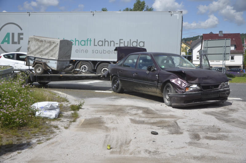 Dabei übersah er offensichtlich den PKW eines 25 jährigen Pkw-Fahrer aus Gilserberg. Dieser schaffte es mit seinem Gespann nicht mehr rechtzeitig zu Bremsen und krachte in die rechte Seite des LKW. Durch den Aufprall wurde nicht nur der mit 400 Liter Diesel gefüllte Tank aufgerissen. Der mitgeführte Pkw-Anhänger bohrte sich zudem mit der Deichsel in die Karosserie des Opel Vectra hinein. Während der Gilserberger nach einer notärztlichen Erstversorgung mit dem Rettungshubschrauber in eine Kasseler Klinik geflogen wurde, blieb der LKW-Fahrer unverletzt. Die Feuerwehr Bad Zwesten sowie Brandschützer aus Borken sicherten die Unfallstelle ab und nahmen auslaufende Betriebsstoffe auf. Die Bundesstraße war während der Rettungs- und Aufräumarbeiten halbseitig, die Landstraße in Richtung Niederurff voll gesperrt. Am Pkw entstand Totalschaden in unbekannter Höhe.