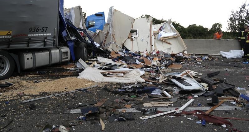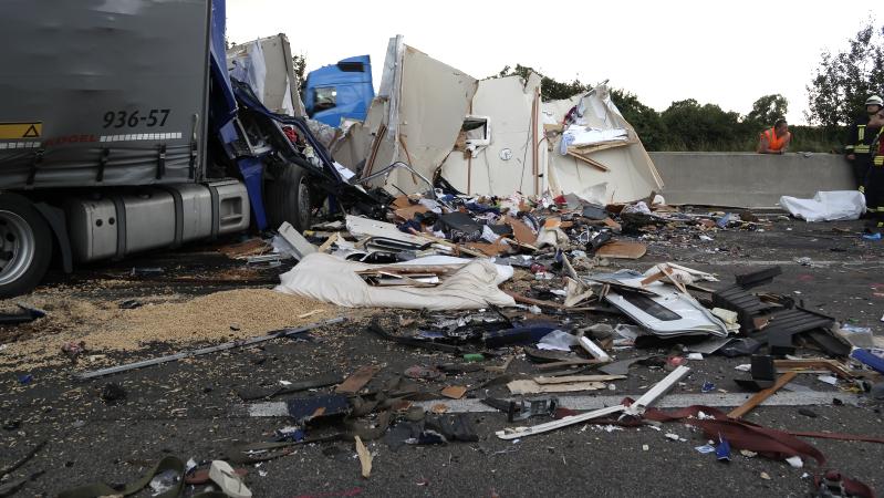 Insgesamt vier LKW, ein Wohnmobil und ein PKW wurden dabei in den Unfall verwickelt. Durch den enormen Aufprall wird das Wohnmobil in Stücke gerissen. Für drei Menschen und drei Hunde die sich in dem Fahrzeug befanden kommt jede Hilfe zu spät, sie sterben in den Trümmern. Eine Person musste mit schwersten, eine weitere mit leichteren Verletzungen in ein Krankenhaus eingeliefert werden. Die Autobahn in Richtung Norden muss stundenlang voll gesperrt werden. Der Verkehr staute sich auf einer Länge von rund 20 Kilometern. Um die genaue Unfallursache feststellen zu können, wurden zwei Gutachter in die Ermittlungen einbezogen. Die Bergungsarbeiten zogen sich über Stunden hin, da Polizei zunächst einmal nach möglichen Verletzten suchen musste. Mit zwei Kranfahrzeugen und einem Bagger mussten die Trümmer von der Strasse geräumt werden. In Containern die mit LKWs abtransportiert wurden, lagen die Überreste der Fahrzeuge des schlimmen Unfalls. Bis in die Nachtstunden hatten die Hilfskräfte damit zu tun die Autobahn wieder frei geben zu können. Der aufgestaute Verkehr konnte ab 22.50 Uhr über die linke spur an der Unfallstelle vorbei geleitet werden. Die Fahrzeuge waren zwar gegen 20.30 Uhr alle abtransportiert, doch die Fahrbahn musste nun noch gereinigt und Betriebsstoffe aufgenommen werden. Gegen 01.20 konnte die Vollsperrung der Autobahn wieder aufgehoben werden. Nach Angaben der Polizei wird der Sachschaden auf rund 300.000 Euro geschätzt.