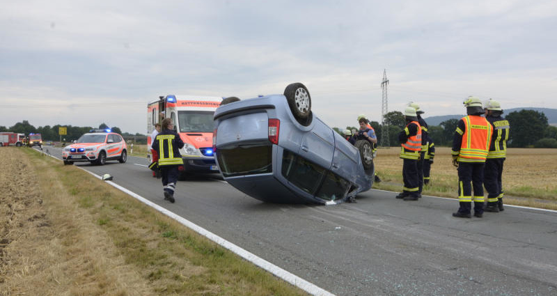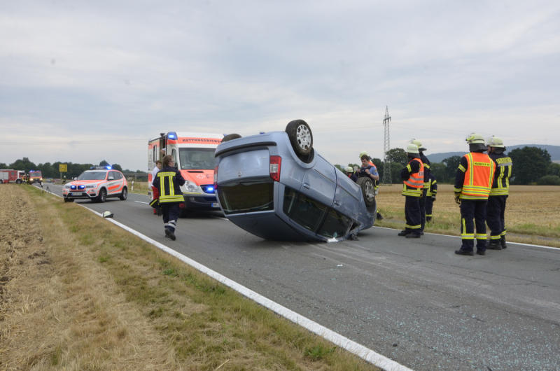 Quer zur Fahrbahn und auf dem Dach liegend kam sie mit ihrem Wagen schließlich zum Stillstand. Durch den Überschlag wurde das Dach sowie die Front schwer Beschädigt. Die Fahrerin zog sich bei dem Unfall Verletzungen zu, welche vom Rettungsdienst und Notarzt versorgt wurden. Zur weiteren Behandlung brachte sie der Rettungsdienst in ein nahegelegenes Krankenhaus. Die Wabernder Feuerwehr war mit rund 20 Einsatzkräften vor Ort im Einsatz.