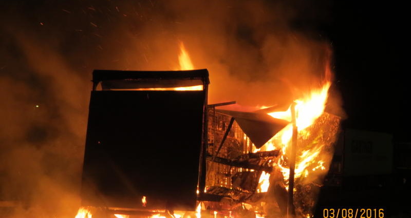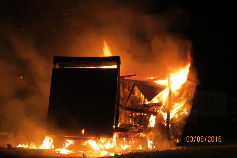 Sofort kuppelte der Fahrer die Zugmaschine ab und rettete sie vor den Flammen. Die verständigte Feuerwehr Butzbach löschte den in Vollbrand stehenden Anhänger, auf dem leere Metallgestelle geladen waren. LKW-Anhänger und Ladung waren jedoch nicht mehr zu retten, an ihnen entstand ein Schaden von rund 10.000 Euro. In gleicher Höhe schätzt die Autobahnmeisterei den am Parkplatz-Belag entstandenen Schaden. Verletzt wurde bei dem Brand niemand. Möglicherweise führte eine überhitzte Bremsanlage zum Feuer am Anhänger.