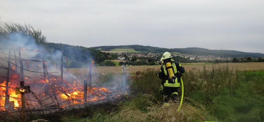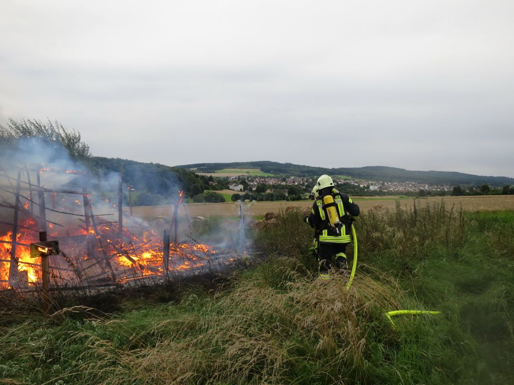 Schnell war klar, dass es sich um eine Feldscheune handelte, die auf einer Wiese an der Landstraße, aber auch unmittelbar an der Autobahn BAB A 44, stand. Als die Feuerwehr am Brandort eintraf, war die Scheune bereits komplett nieder gebrannt. Mit dem Wasser der 3 Löschfahrzeuge konnte der Brand schnell gelöscht werden, um Glutnester zu ersticken wurde die Brandstelle anschließend mit Schaum geflutet. Zusätzlich wurde eine Wasserversorgung vom Betriebsgebäude des Schulbergtunnels zur Einsatzstelle verlegt. Die Wegstrecke der Schlauchleitung betrug 400 Meter. Verletzt wurde niemand, es entstand nur Sachschaden in bislang unbekannter Höhe. Die Brandursache ist bis zum jetzigen Zeitpunkt noch völlig unklar. Wegen der starken Rauchentwicklung kam es kurzzeitig zu Behinderungen auf der BAB A44. Zum Einsatz kam die Feuerwehr Hessisch Lichtenau und Walburg mit sieben Fahrzeugen und insgesamt 33 Einsatzkräften. Das DRK war mit Rettungswagen und zwei Mann Besatzung vor Ort.