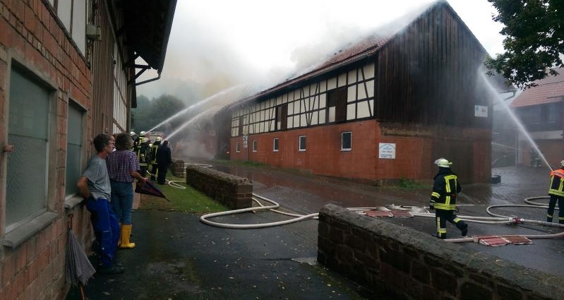 Kurze Zeit später war aus dem Gebäude noch eine Explosion zu hören, die, so wird von der Feuerwehr vermutet, von einer explodierten Propangas Flasche stammte. Feuerwehren aus dem gesamten Haunetal und die Drehleiter aus Bad Hersfeld rückten mit ca. 90 Einsatzkräften zum Einsatzort aus, konnten aber nicht verhindern, dass die Scheune mit Stallungen völlig ausbrannte und teilweise einstürzte. Angrenzende Gebäudeteile und ein Wohngbäude konnten von der Feuerwehr erfolgreich geschützt werden. Die Wasserversorgung wurde über den im Ort verlaufenden Pfuhlgraben gesichert. In den Stallungen befanden sich zum Zeitpunkt des Feuers ca. 100 Schweine. 10 Schweine konnten durch Anwohner und Feuerwehrkräfte zu Beginn der Löscharbeiten noch aus dem Stall geholt werden, 16 Schweine konnten geborgen werden, als das Feuer unter Kontrolle war. Die restlichen Schweine (ca. 70) sind im Feuer verendet. Zeitgleich mit den Nachlöscharbeiten muss nunmehr die direkt an der Hauptstraße liegende Außenwand des Gebäudes nach innen gedrückt werden, damit der Verkehr danach wieder ungehindert fliessen kann. Personen wurden bei dem Feuer nicht verletzt. Über die Höhe des Sachschadens konnten noch keine genauen Angaben gemacht werden, es wird jedoch vermutet, dass sich der Sachschaden auf mehrere 100.000 Euro beläuft.