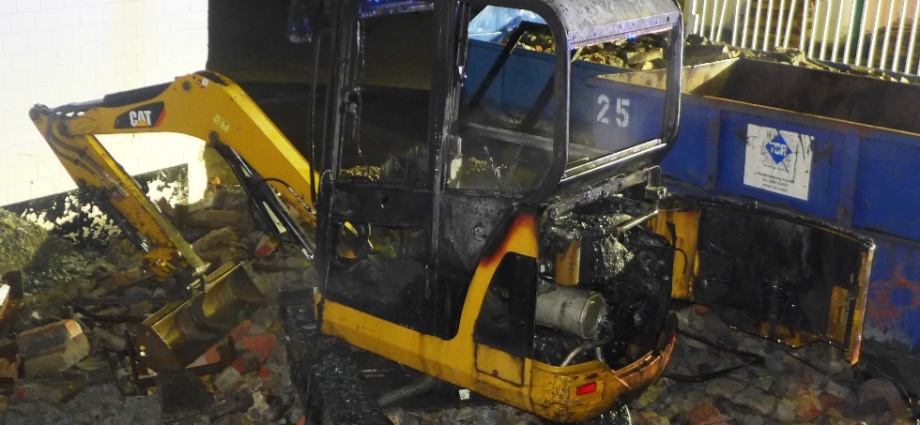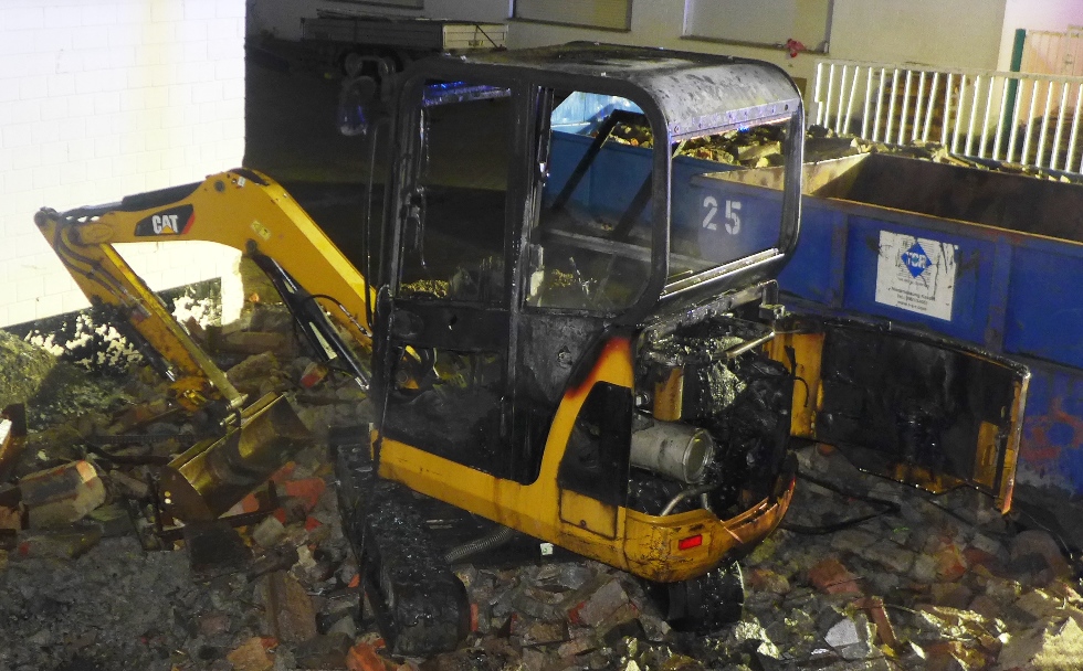 Nun bitten Polizei um weitere Zeugenhinweise zum Täter. Wie ein Zeuge gegenüber den am Brandort eingesetzten Beamten berichtet, reißt ihn gegen kurz nach 5 Uhr ein Knall aus dem Schlaf. Beim Blick aus dem Fenster beobachtet er einen Mann, der auf dem Betriebsgelände einer Baufirma an der Hegelsbergstraße, Ecke Quellhofstraße die Scheibe eines Mini-Baggers einschlägt und anschließend darin Brandbeschleuniger entzündet. Die selbstfahrende Arbeitsmaschine geht in Flammen auf und brennt völlig aus. Der bislang unbekannte Mann flüchtet unmittelbar nach der Inbrandsetzung die Hegelsbergstraße in Richtung der Bunsenstraße hinab. Der Täter wird mit einer schlanken, sportlichen Figur und einer Größe zwischen 1,80 m bis 1,85 m beschrieben. Er soll zur Tatzeit einen schwarzen Kapuzenpullover und eine schwarze Jogginghose getragen haben. Auf einem Hosenbein sei eine weiße Aufschrift aufgedruckt.