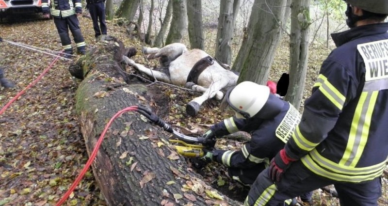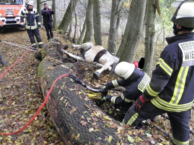 Wiesbaden – Ein Pferd hat sich am Sonntagmittag kopfüber zwischen zwei Bäumen im Wald am Lippbach in Frauenstein verkeilt. Die Feuerwehr Wiesbaden rückte mit ihrem Rüstzug zur Befreiung des Tieres aus.