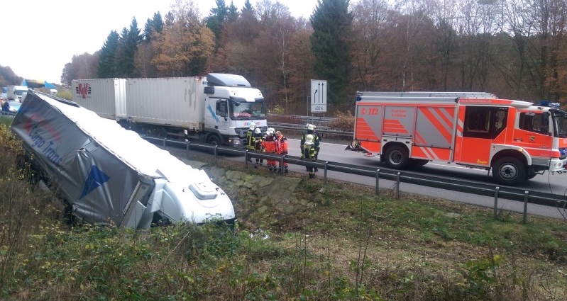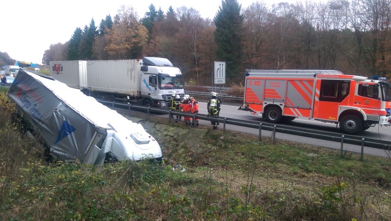 Der Sattelzug rutschte nach rechts über die Standspur in einen Flutgraben und von dort bergab fast 100 Meter weiter bis zu einem Wasserdurchlauf, der unter der A7 hindurch führt. Ersthelfer, die sofort an der Unfallstelle anhielten, befreiten den Fahrer über eine eingeschlagene Scheibe der Fahrertür und übergaben ihn dem Rettungsdienst. Ein Rettungswagen brachte den verletzten Fahrer in ein nahe gelegenes Krankenhaus. Die Feuerwehr aus Kirchheim rückte aus, da zuerst vermutet wurde, das der Fahrer in seinem Fahrzeug eingeklemmt ist. Die Bergung des Sattelzuges wird vermutlich mehrere Stunden andauern, da der komplette Sattelzug im Flutgraben eingekeilt ist. Ob Betriebsstoffe in das Erdreich gelaufen sind kann erst festgestellt werden, wenn die Bergung des Sattelzuges vorgenommen wird. Über die Höhe des Sachschadens konnten noch keine Angaben gemacht werden.