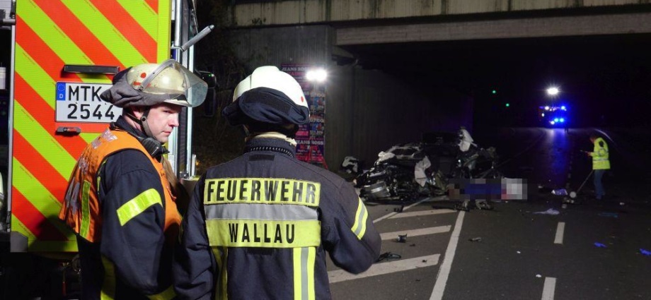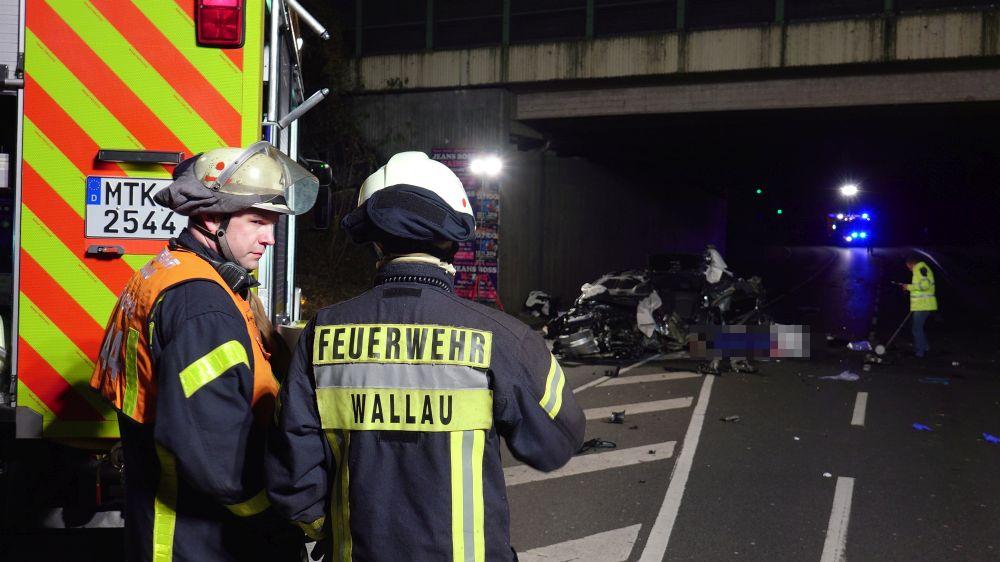 In beschriebener Fahrtrichtung vor einer dort befindlichen Unterführung geriet ein Opel Corsa aus derzeit noch ungeklärter Ursache nach links von der Fahrbahn ab, stieß gegen einen Brückenpfeiler und wurde anschließend wieder auf die Fahrbahn geschleudert. Bei dem Unfall wurde die linke Fahrzeughälfte stark beschädigt. Durch die Folge des Aufpralls wurden der Fahrer und ein Mitfahrer tödlich verletzt, die beiden weiteren Insassen vermutlich schwer verletzt. Nach Sachvortrag bei der Staatsanwaltschaft Frankfurt wurden ein Arzt für Blutentnahmen angefordert, das Unfallfahrzeug sichergestellt und ein Sachverständiger für die Unfallrekonstruktion verständigt. Die Landstraße 3017 sowie die Autobahnabfahrten Hofheim-Wallau wurden vollgesperrt, der Fahrzeugverkehr wurde örtlich umgeleitet. Während der Maßnahmen an der Unfallstelle waren zahlreiche Einsatzkräfte der Feuerwehr Hofheim-Wallau, Rettungswagen und Notarztwagen aus dem Umland sowie neun Funkstreifenwagen aus dem Main-Taunus Kreis und Wiesbaden eingesetzt.