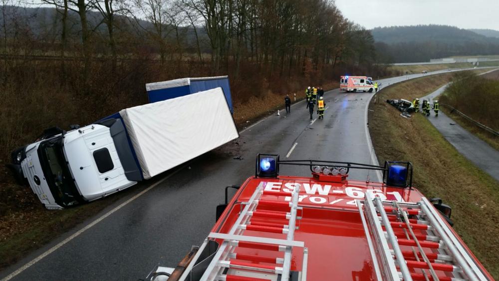Der Fahrer des Hängerzuges versuchte noch nach rechts auszuweichen, kam in die Bankette, verlor so die Kontrolle über sein Fahrzeug und kippte um. Der Anhänger hingegen blieb im Graben stehen. Der 59-jährige LKW Fahrer aus Waltershausen konnte sich weitgehend unverletzt aus seinem Fahrzeug befreien. Der junge Mann aus Eschwege wurde in seinem Fahrzeug eingeklemmt und musste von der Feuerwehr befreit werden. Trotz intensiver Bemühungen von Notarzt und Rettungsdienst verstarb der Mann an den Folgen seiner schweren Verletzungen. Wie es zu dem Unfall kommen konnte ist aktuell noch völlig unklar. Um die genaue Ursache des schweren Unfalls feststellen zu können, wurde ein Gutacher in die Ermittlungen einbezogen.Neben Polizei und Rettungsdienst kam auch die Feuerwehr Waldkappel zum Einsatz.