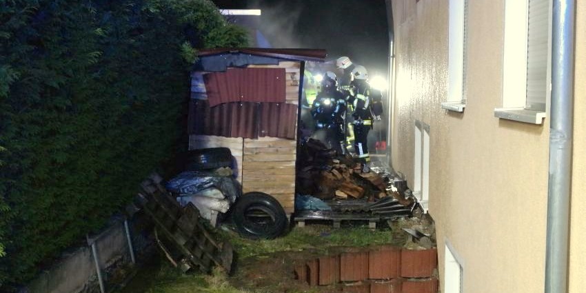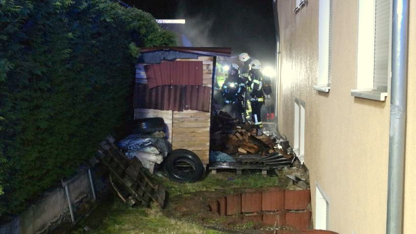 In den rund 5×2 Meter großen Schuppen war Holz gelagert. Das Feuer konnte schnell unter Kontrolle gebracht werden. An dem Mehrfamilienhaus schmolzten die Fenster-Rolläden durch die Hitze. Im Einsatz war auch das neue Fahrzeug, ein HLF 20 von der Feuerwehr Niestetal. Die Brandursache ist unklar.