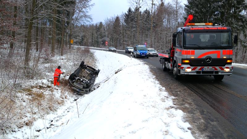 Kassel – Am Sonntagnachmittag kam es zu einen Alleinunfall auf der B251 in Höhe der Rasenallee. Eine PKW-Fahrerin befuhr die Bundesstraße von Habichtswald kommend. Kurz nach der Ampelkreuzung in Fahrtrichtung Harleshausen verlor die Fahrerin vermutlich aufgrund von Straßenglätte in einer Kurve die Kontrolle über ihr Fahrzeug, kam nach rechts von der Fahrbahn ab und stürzte rund fünf Meter tief einen Abhang hinunter.