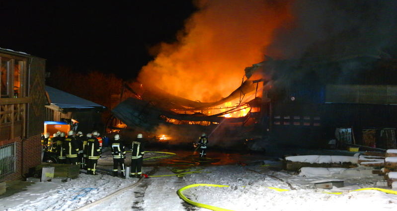 Schauenburg – Am Sonntagabend gegen 21.17 Uhr wurde die Feuerwehr zu einem Industriebrand nach Schauenburg-Hoof alarmiert. Weithin sichtbar war die Rauchwolke und der Feuerschein. Eine Produktionshalle des Sägewerks Brede in Hoof war am späten Abend in Flammen aufgegangen. Rund 180 Einsatzkräfte aus der gesamten Region wurden zur Einsatzstelle gerufen, um das Großfeuer unter Kontrolle zu bringen.