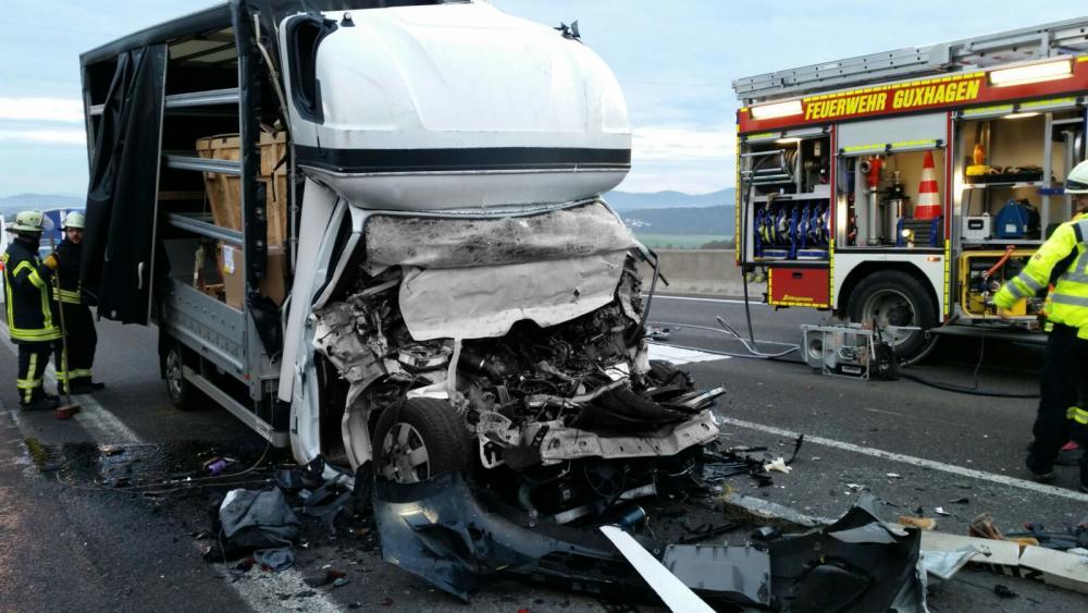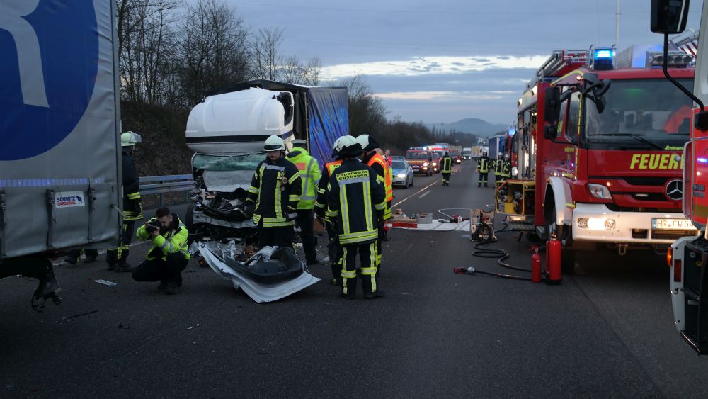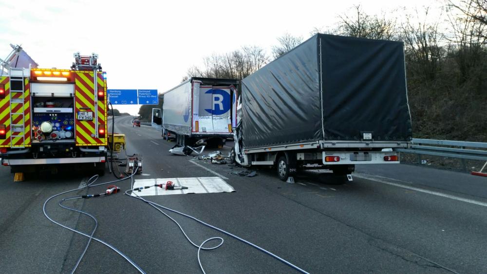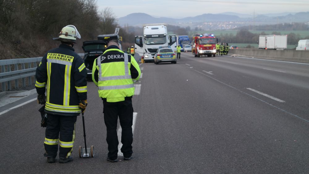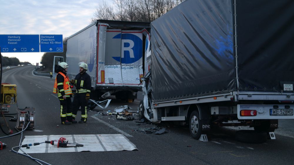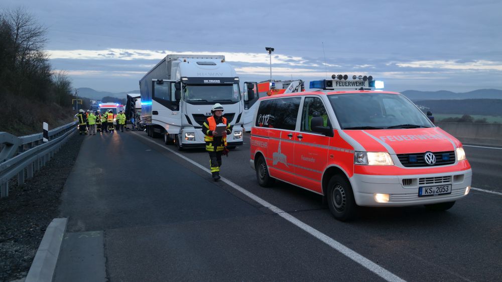 Der Fahrer eines Klein-LKW übersah offensichtlich das Fahrzeug und fuhr mit hoher Geschwindigkeit in das Heck des Sattelzuges. Der Aufprall war so heftig, dass das komplette Fahrerhaus zerstört wurde. Der Fahrer wurde in seinem Fahrzeug massiv eingeklemmt und so schwer verletzt, das er noch an der Unfallstelle verstarb. Die Einsatzkräfte der Feuerwehr Guxhagen und die Berufsfeuerwehr Kassel bargen den Mann aus dem Wrack. Um die genaue Unfallursache feststellen zu können, wurde ein Gutachter in die Ermittlungen einbezogen. Während des gesamten Einsatzes musste die A7 voll gesperrt werden. Der Verkehr wurde über die Anschlussstelle Guxhagen abgeleitet. Auch bei diesem Einsatz hatten die Rettungskräfte wieder einmal damit zu kämpfen die Einsatzstelle überhaupt zu erreichen. LKW standen kreuz und quer über alle Fahrspuren und eine Rettungsgasse hatte hier niemand gebildet.