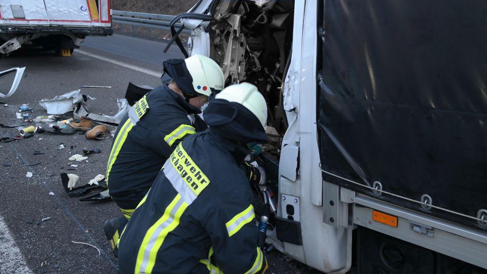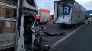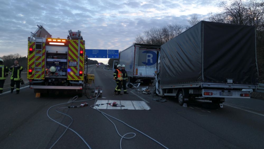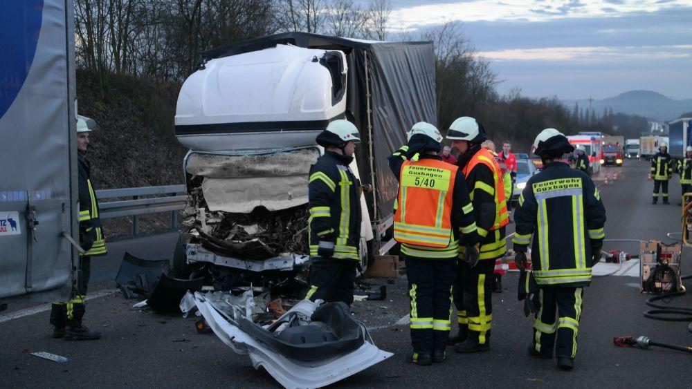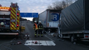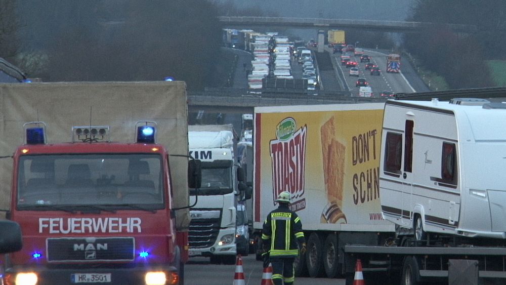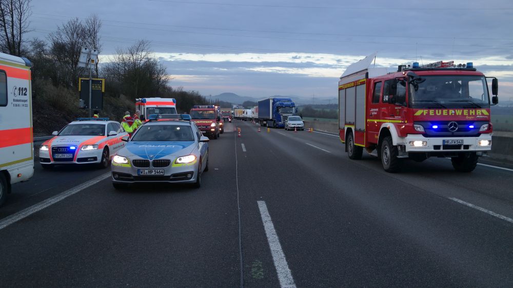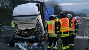 Der Fahrer eines Klein-LKW übersah offensichtlich das Fahrzeug und fuhr mit hoher Geschwindigkeit in das Heck des Sattelzuges. Der Aufprall war so heftig, dass das komplette Fahrerhaus zerstört wurde. Der Fahrer wurde in seinem Fahrzeug massiv eingeklemmt und so schwer verletzt, das er noch an der Unfallstelle verstarb. Die Einsatzkräfte der Feuerwehr Guxhagen und die Berufsfeuerwehr Kassel bargen den Mann aus dem Wrack. Um die genaue Unfallursache feststellen zu können, wurde ein Gutachter in die Ermittlungen einbezogen. Während des gesamten Einsatzes musste die A7 voll gesperrt werden. Der Verkehr wurde über die Anschlussstelle Guxhagen abgeleitet. Auch bei diesem Einsatz hatten die Rettungskräfte wieder einmal damit zu kämpfen die Einsatzstelle überhaupt zu erreichen. LKW standen kreuz und quer über alle Fahrspuren und eine Rettungsgasse hatte hier niemand gebildet.