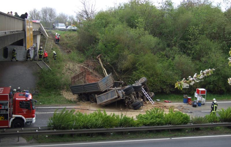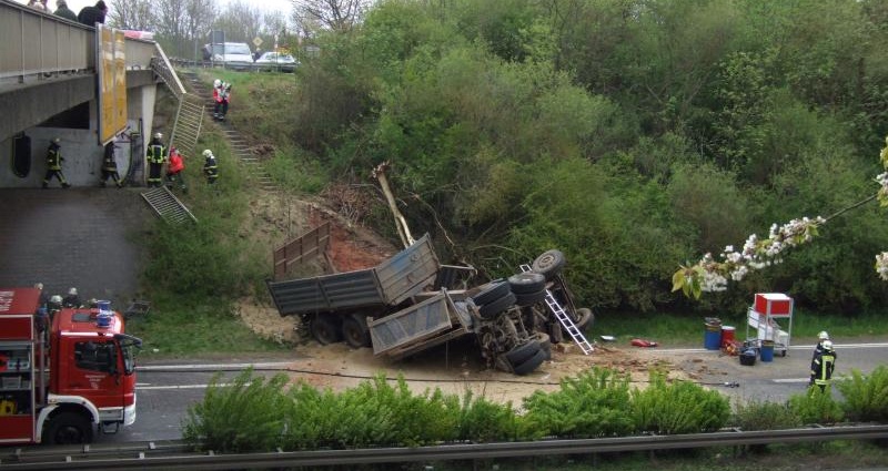 Marburg – Am Samstag kam es gegen 12.20 Uhr auf der Brücke zwischen den Anschlussstellen zur B3 nach Marburg und B 62 nach Stadtallendorf zu einem folgenschweren Unfall zwischen einem blauen VW Tiguan und einem mit Steinerde beladenen Lkw-Kipper mit Doppelachsanhänger. Nach dem Zusammenstoß durchbrach der Lastwagen die Schutzplanke und das Brückengelände und stürzt entlang der Böschung hinunter auf die Kraftfahrstraße.