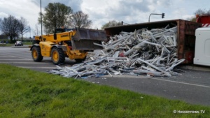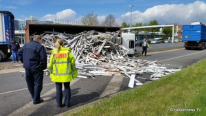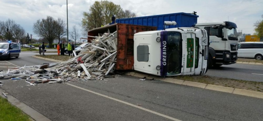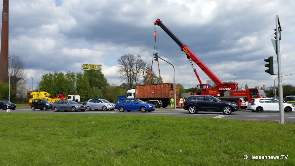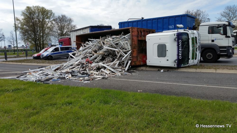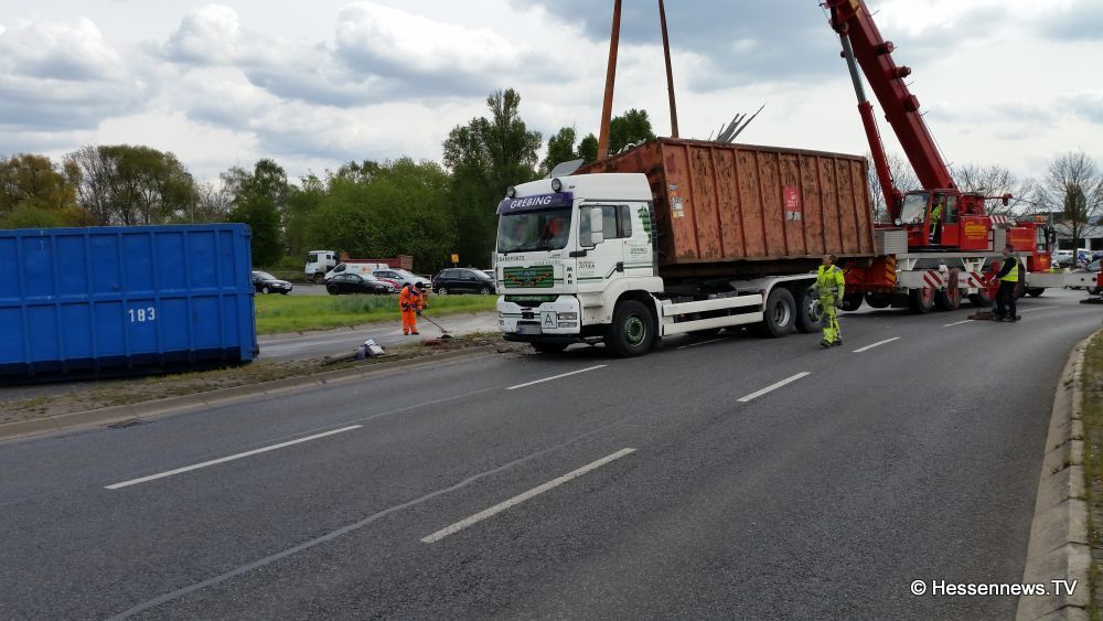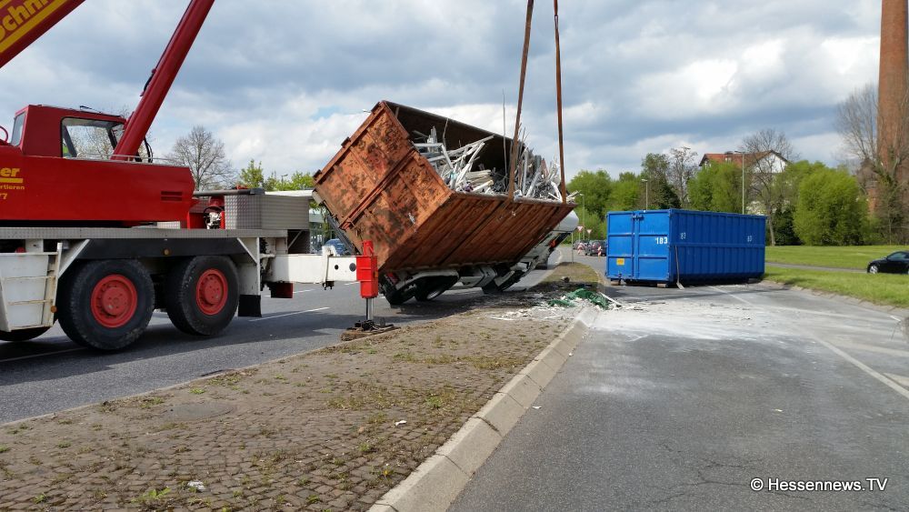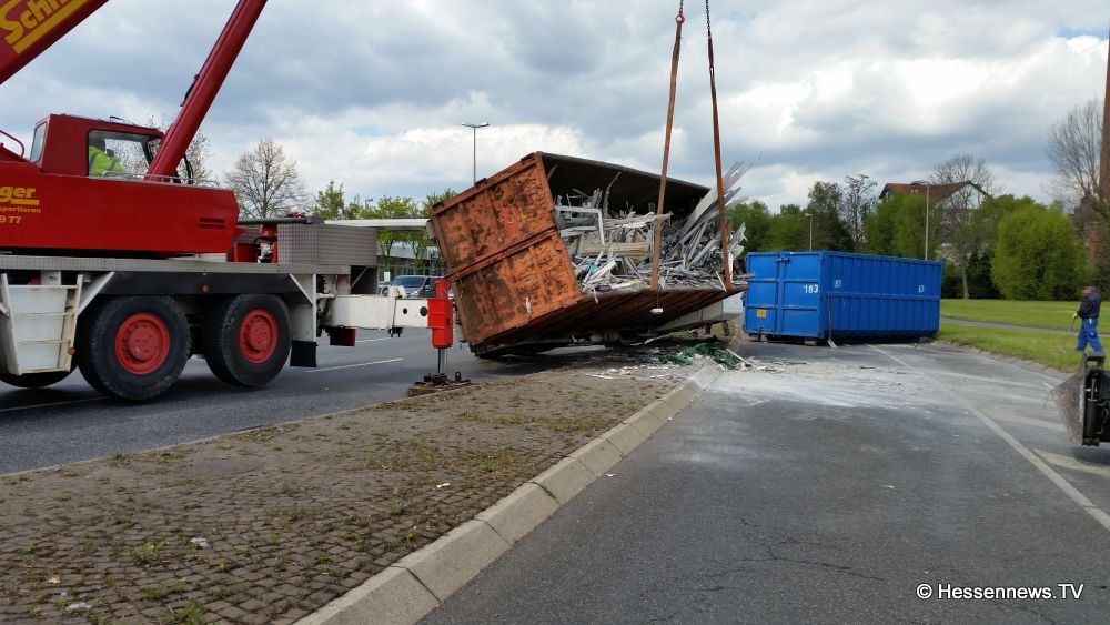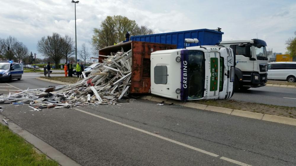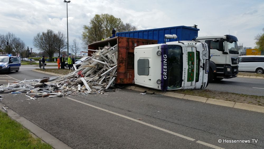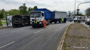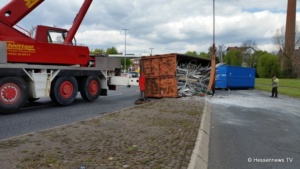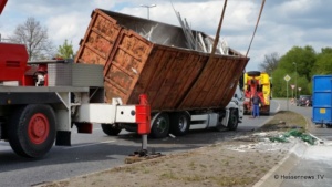 Kurz nach der Ampelkreuzung bog er nach links ab und die Zugmaschine des Containerfahrzeuges kippte plötzlich auf die Seite. Der Anhänger blieb dabei stehen. Eine Polizei Streife die in diesem Bereich zufällig stand teilte uns mit, das der LKW weder überladen noch zu schnell gefahren sei. Eine mögliche Erklärung könnte eine einseitige Beladung gewesen sein. Der Fahrer wurde bei dem Unfall nicht verletzt und konnte sich selbst aus dem Fahrzeug befreien. Der LKW hatte Bauschutt geladen, der zum größten Teil auf der Strasse landete. Ein zur Einsatzstelle gerufener Kran, musste das Fahrzeug wieder aufstellen. Es kam zu erheblichen Behinderungen, jedoch konnte der Verkehr an der Unfallstelle vorbei geleitet werden.