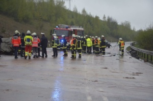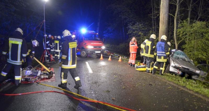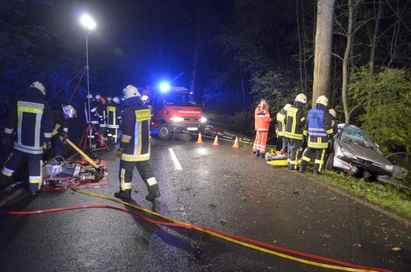 Reinhardshausen – Aus bislang ungeklärten Umständen krachte am späten Dienstagabend nahe Reinhardshausen Ausgangs einer Linkskurve ein PKW gegen einen Baum. Dabei wurden beide Fahrzeuginsassen schwer verletzt und eingeklemmt. Da das Fahrzeug an einem Hang lag, sicherten die Feuerwehr Bad Wildungen und Odershausen das Fahrzeug von zwei Seiten gegen weiteres abrutschen ab.