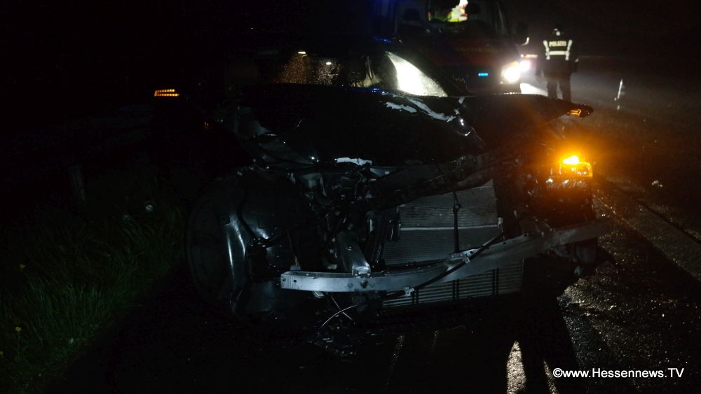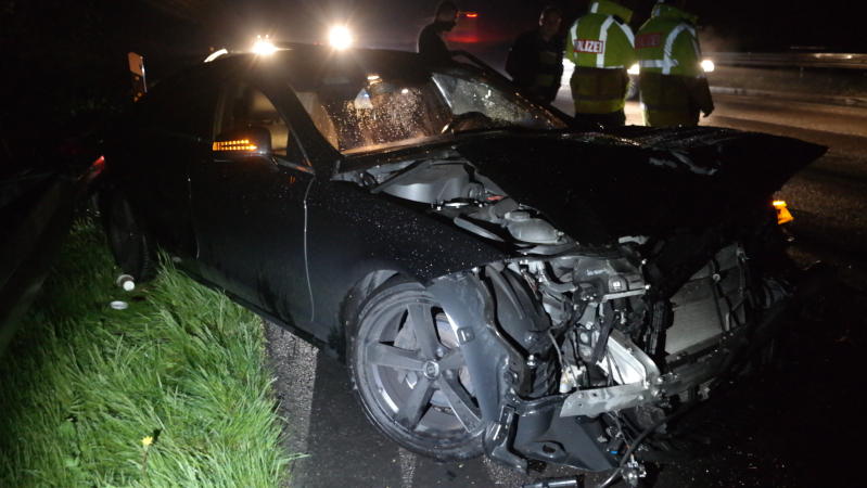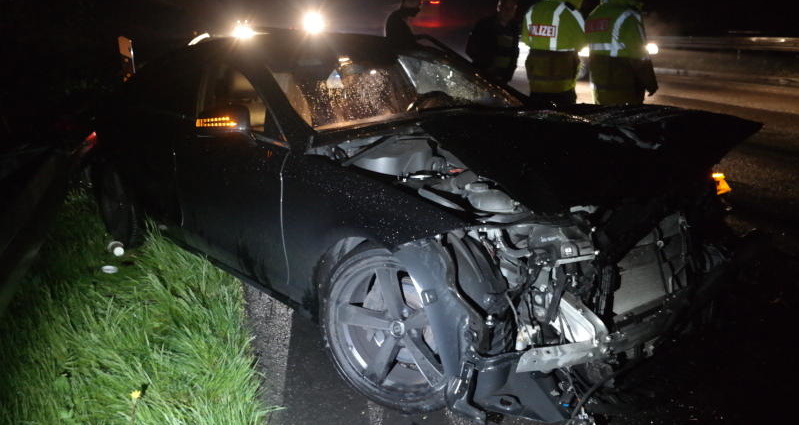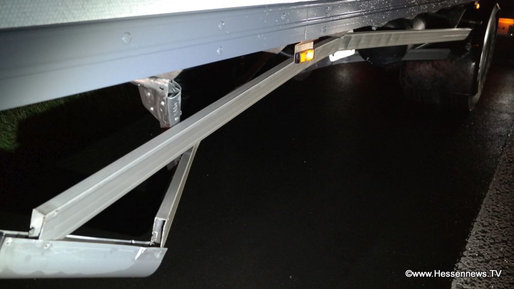 Zunächst schleuderte das Fahrzeug unter den Anhänger des LKW wurde hier abgewiesen krachte in die Mittelleitblanke und schleuderte dann noch einmal gegen die linke leitblanke und kam dort auch zum stehen. Im Fahrzeug befanden sich drei Personen, wobei der Beifahrer verletzt wurde und nach einer ärztlichen Erstversorgung an der Unfallstelle in ein Krankenhaus eingeliefert wurde. Die beiden anderen Insassen, sowie der LKW Fahrer wurden nicht verletzt. Das Unfallfahrzeug erlitt einen Totalschaden. Während der Unfallaufnahme wurde der Verkehr einspurig an der Unfallstelle vorbei geleitet. Ein Fahrer, oder Fahrerin erkannte offensichtlich die Absperrlampen der Polizei zu spät, fuhr darüber und entfernte sich. Die Teile flogen über die Fahrbahn und ein nachfolgender PKW fuhr darüber. Schaden entstand an seinem Fahrzeug nicht.