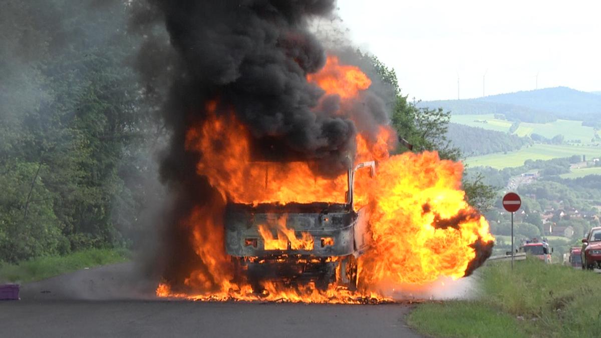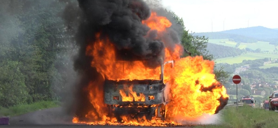 Kirchheim – Auf der A7 in Fahrtrichtung Kassel kurz hinter dem Kirchheimer Dreieck fing ein Sattelzug am Mittwoch gegen 17.40 Uhr an zu brennen. Vermutlich durch einen technischen Defekt fing die Fahrerkabine an zu kokeln. Der 37-jährige tschechische Fahrer hielt sein Sattelzug kurz hinter dem Kirchheimer Dreieck an und verließ aufgrund der Rauchentwicklung die Fahrerkabine. Kurz danach stand die Fahrerkabine schon im Vollbrand. Der Sattelzug hatte 25 Tonnen Papierrollen geladen, welche ebenfalls Feuer fingen. Obwohl die Feuerwehr aus Kirchheim recht schnell am Unfallort war, brannte der Sattelzug komplett aus.