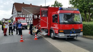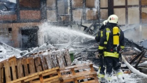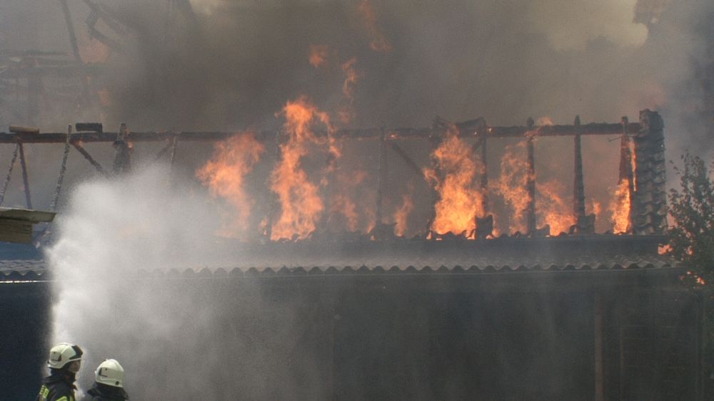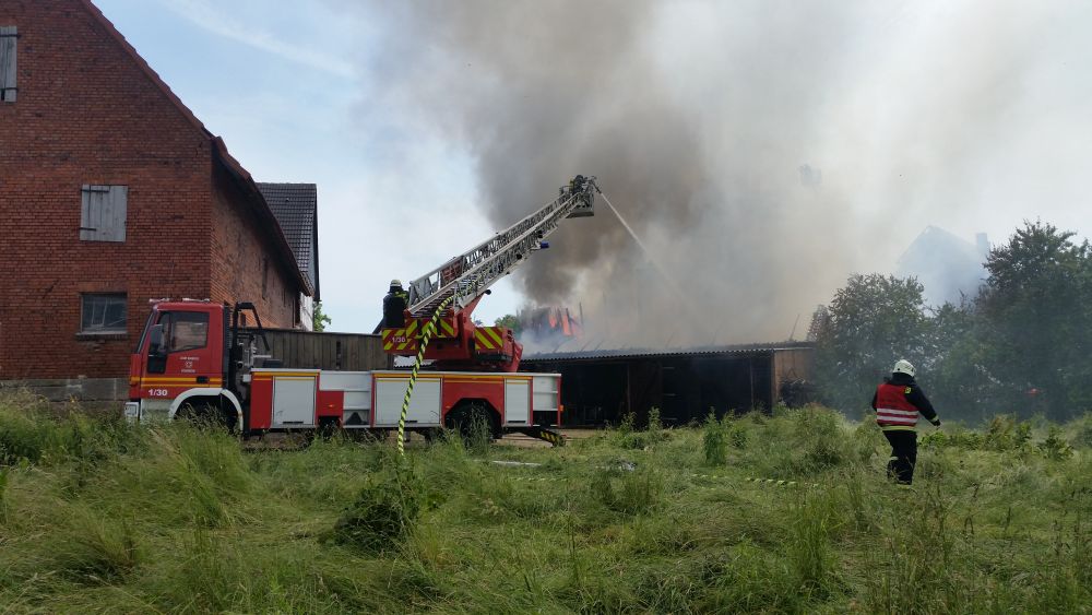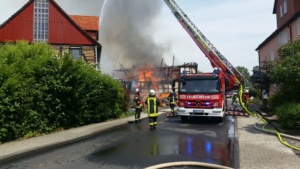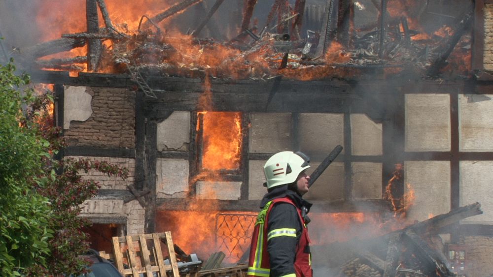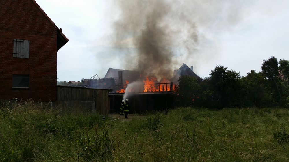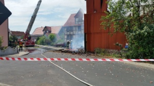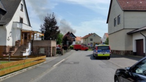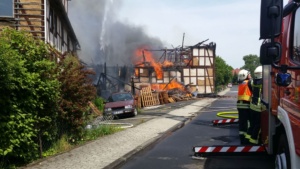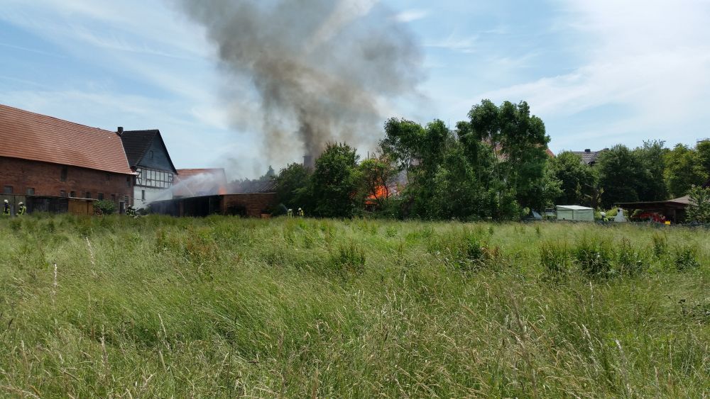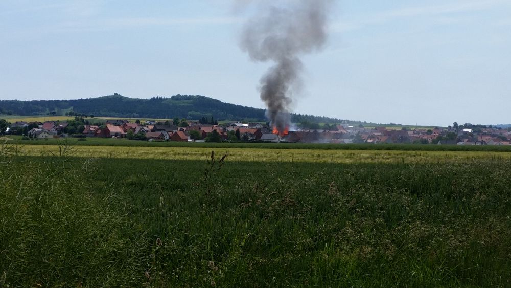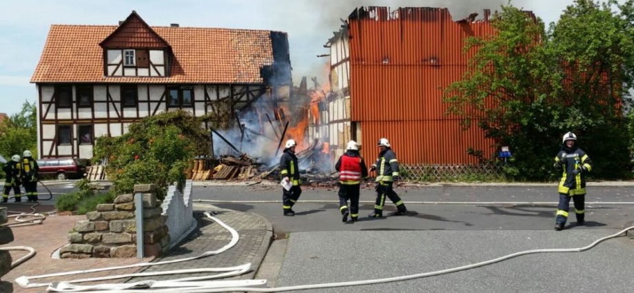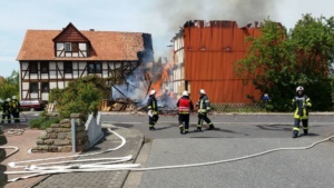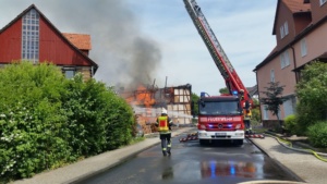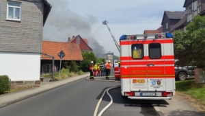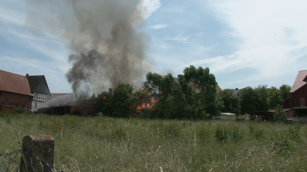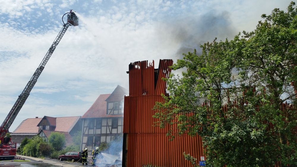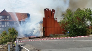 Bad Emstal – Am Donnerstagmittag kam es etwa gegen 12.30 Uhr zu einem Großbrand in Balhorn, einem Ortsteil von Bad Emstal. In einer Scheune mitten in der Ortslage kam es bisher noch nicht geklärter Ursache zu einem Brand. Schon auf der Anfahrt war eine hohe Rauchsäule und aus dem Dachbereich schlagende Flammen zu sehen. Schon hier war klar, das das Gebäude den Kampf gegen die Flammen verloren hatte.