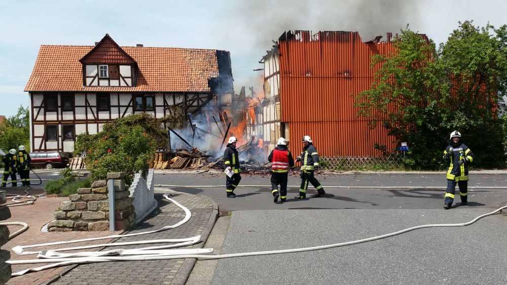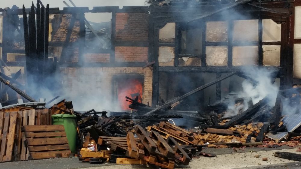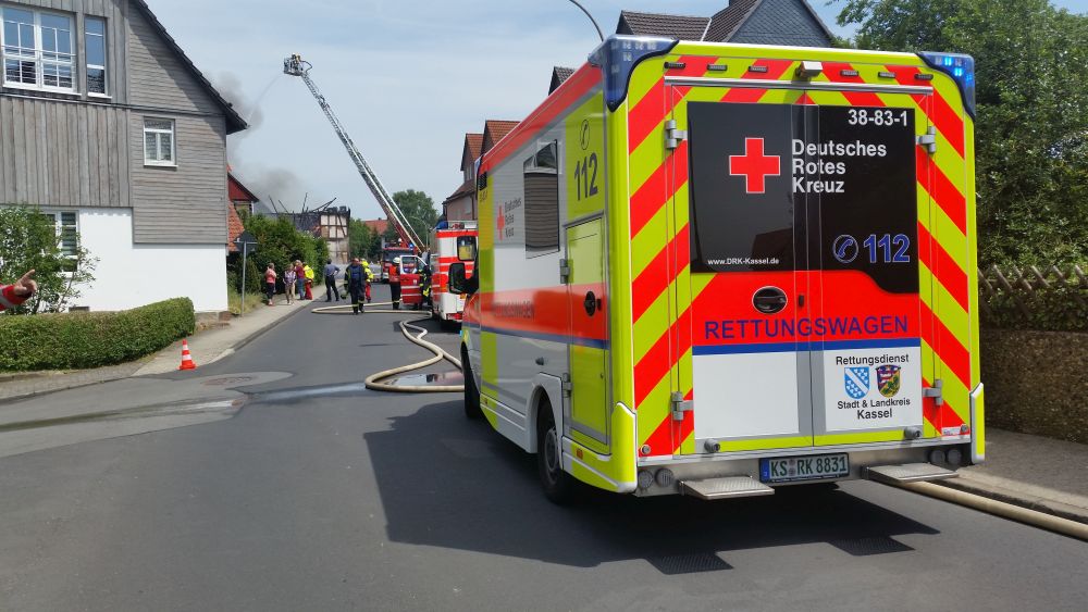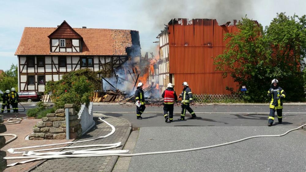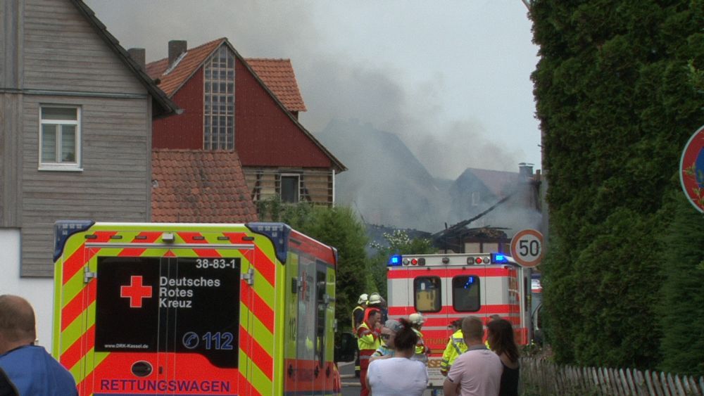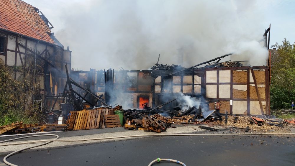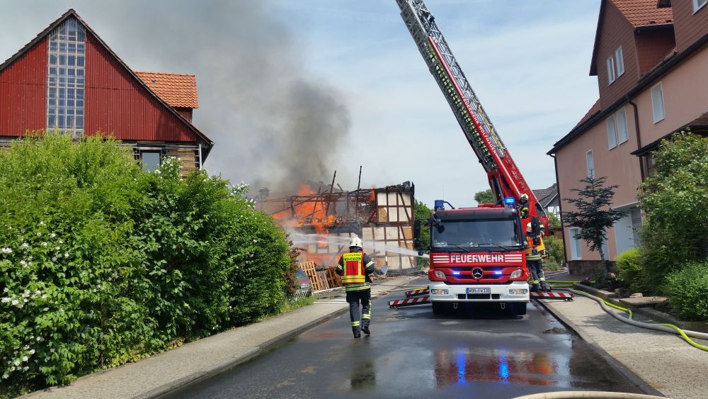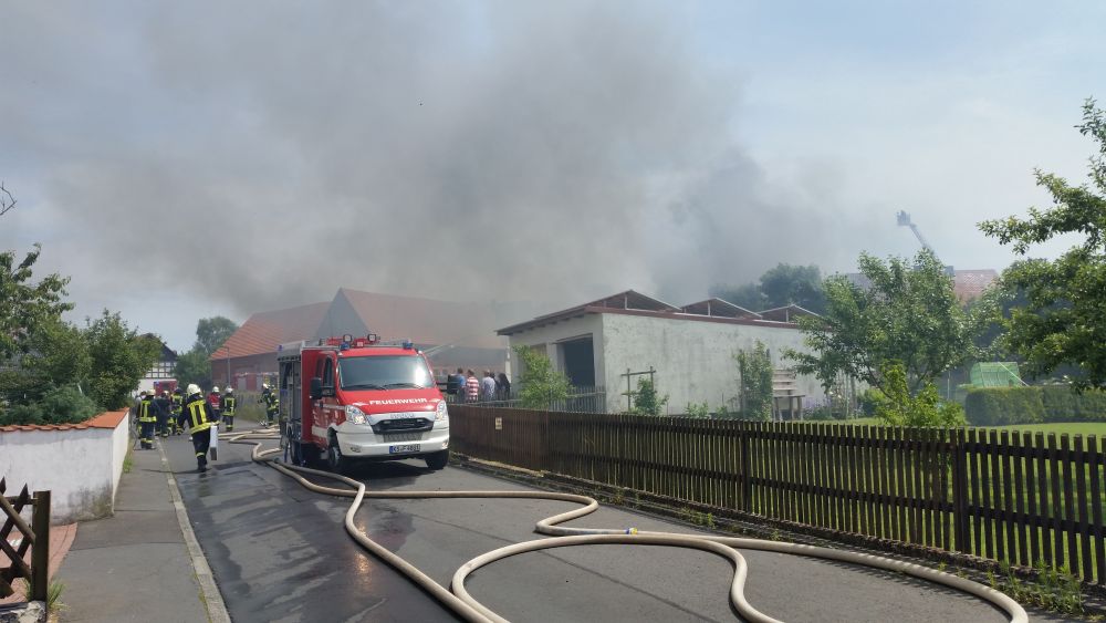 Nun galt es das Feuer von zwei Seiten so weit unter Kontrolle zu bekommen, das weder das angrenzende Wohnhaus noch umliegende Häuser in Brand geraten. Ein Wohnhaus wurde durch eine ständige Wasserzufuhr gekühlt und überstand den Brand nach letzten Informationen unbeschädigt. Das direkt an die Scheune grenzende Haus wurde stark in Mitleidenschaft gezogen. Im Haus befand sich nach Angaben der Polizei sehr viel Unrat, die Scheune soll leer gewesen sein. Auf Grund der enormen Rauchentwicklung wurde eine Rundfunkwarnung heraus gegeben, die Fenster und Türen geschlossen zu halten. Feuerwehren aus dem gesamten Landkreis waren mit rund 200 Einsatzkräften an der Brandbekämpfung beteiligt. Auch die Drehleiter aus Baunatal und Wolfhagen waren im Einsatz. Wie uns Bürgermeister Ralf Pfeiffer mitteilte, wurde auch das Schwimmbad zur Wasserentnahme genutzt. Hier standen rund 630 m³ zur Verfügung. Nachdem der Brand unter Kontrolle war, kam Schaum zum Einsatz, um die Glutnester zu ersticken. Im Haus befanden sich beim Brandausbruch weder Mensch noch Tier. Bei den Löscharbeiten wurde ein Feuerwehrmann leicht verletzt. Nach Angaben der Polizei wird der Sachschaden nach vorsichtigen Schätzungen mit rund 120.000.- Euro beziffert.